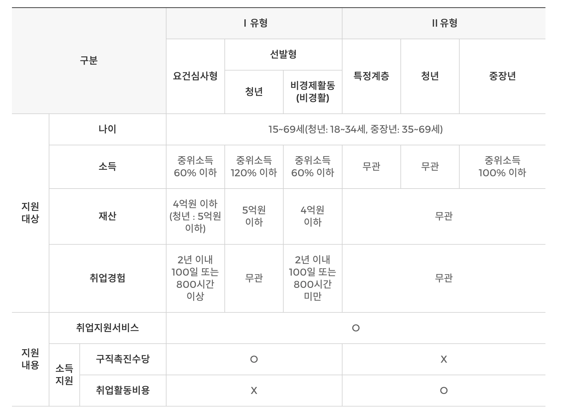 국민취업제도는 두 가지 유형으로 나뉩니다. 두 유형은 지원해주는 대상이 다릅니다. 본인의 유형은 아래 링크에서 자가진단이 가능합니다.