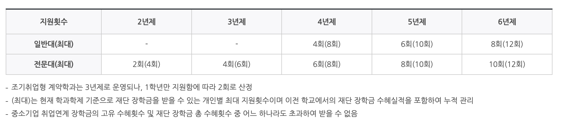 하지만 장학금 혜택을 받으면 혜택을 받은 기간만큼 중소기업 종사 의무를 이행해야합니다. 의무종사기간은 수혜횟수*6개월입니다. 만약 본인이 2학년 1학기, 2학년 2학기 두 차례에 걸쳐 수혜를 받았다면 총 12개월 중소기업에서 의무 종사를 이행해야합니다.