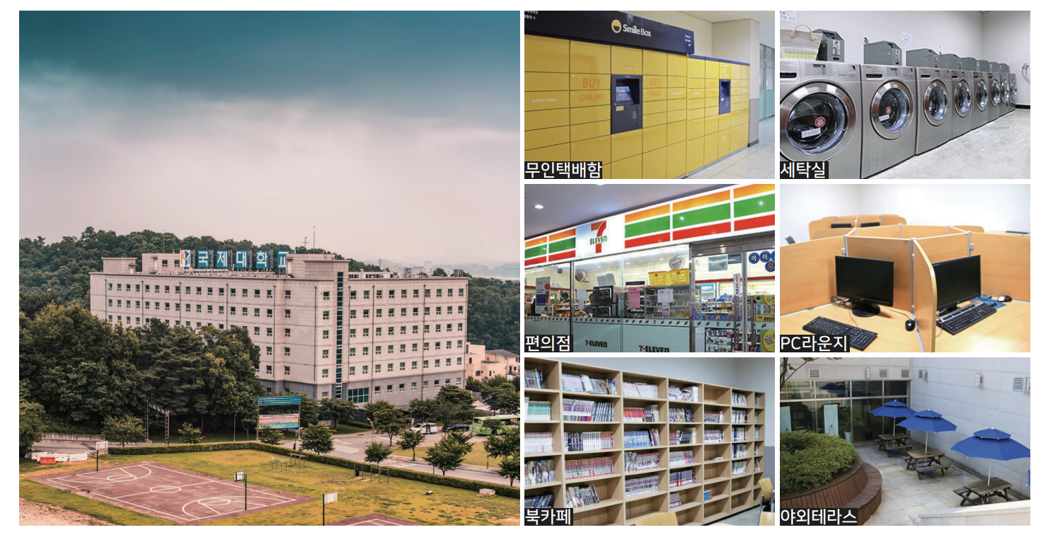 두 번째로 기숙사예요. 우리 국제대 기숙사는 500명 이상을 수용할 수 있고 기숙사 내에 무인택배함, 편의점, PC라운지 등 다양한 시설을 제공하고 있어요.