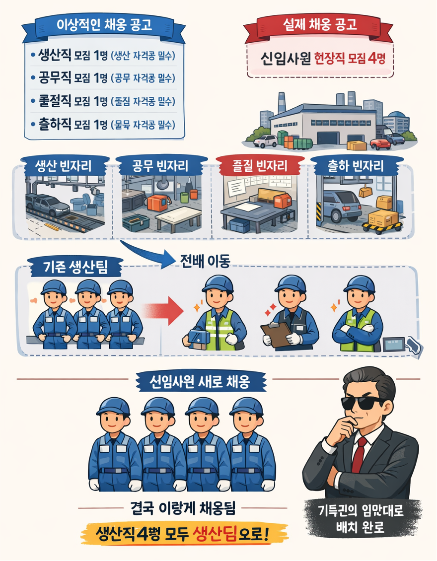 일반적인 생산부서나 품질 물류 등 특별한 기술조건이 필요 없는 경우에는, 랜덤배치가 우선될 수 있다.
