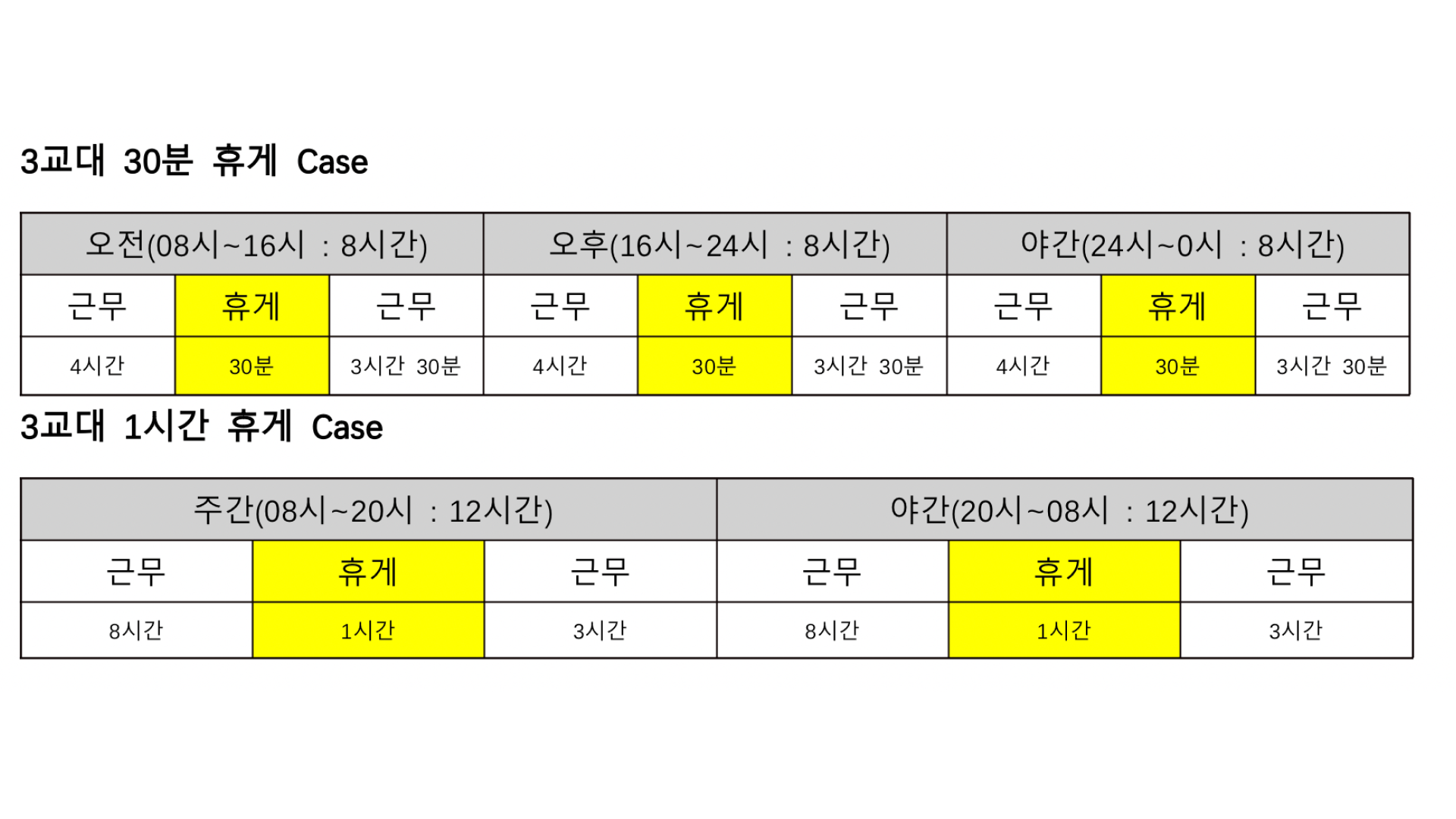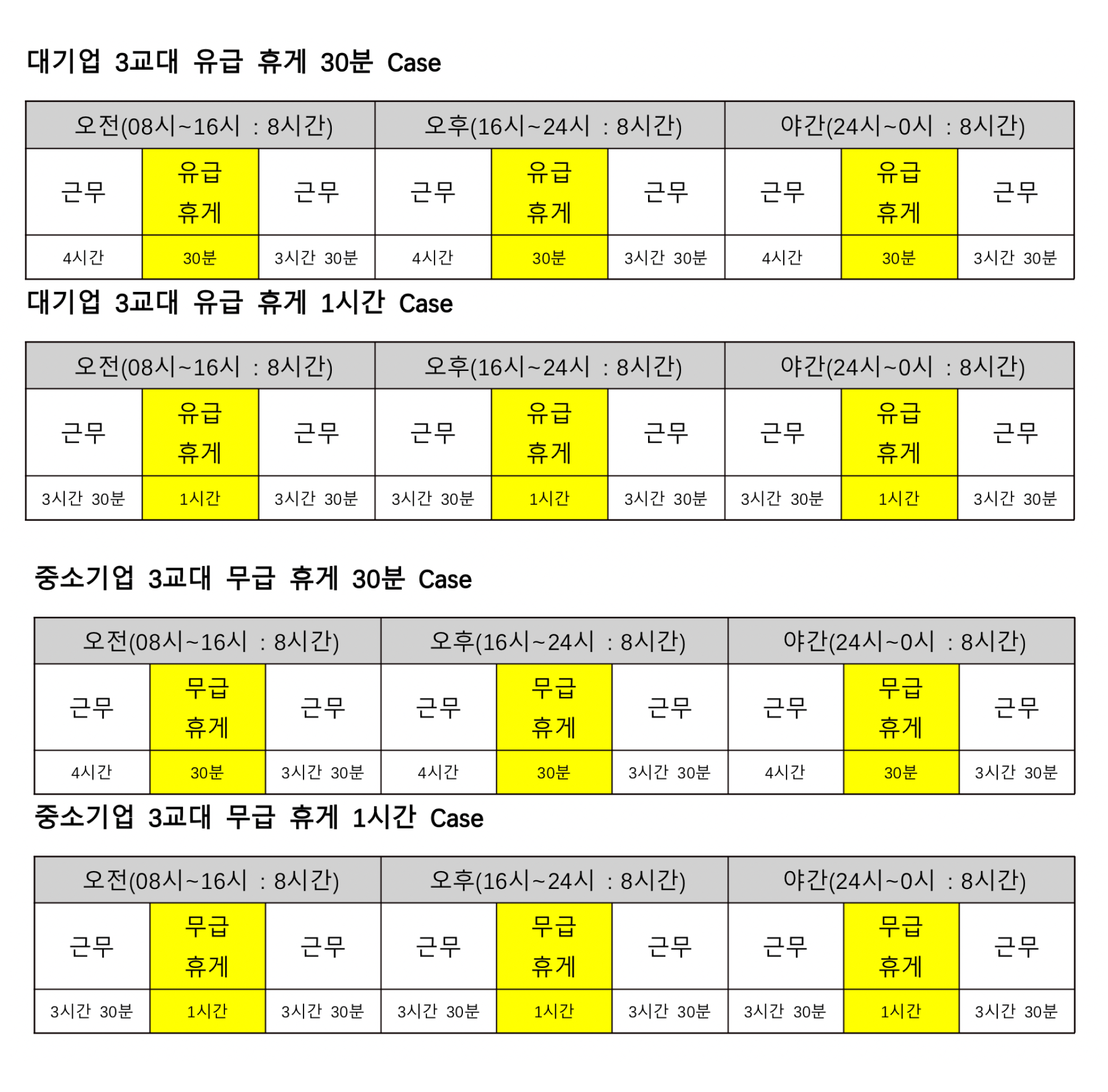 3교대일 경우 총 휴게시간 포함 근로가 8시간 일 시 7시간 30분 근무, 30분 휴게