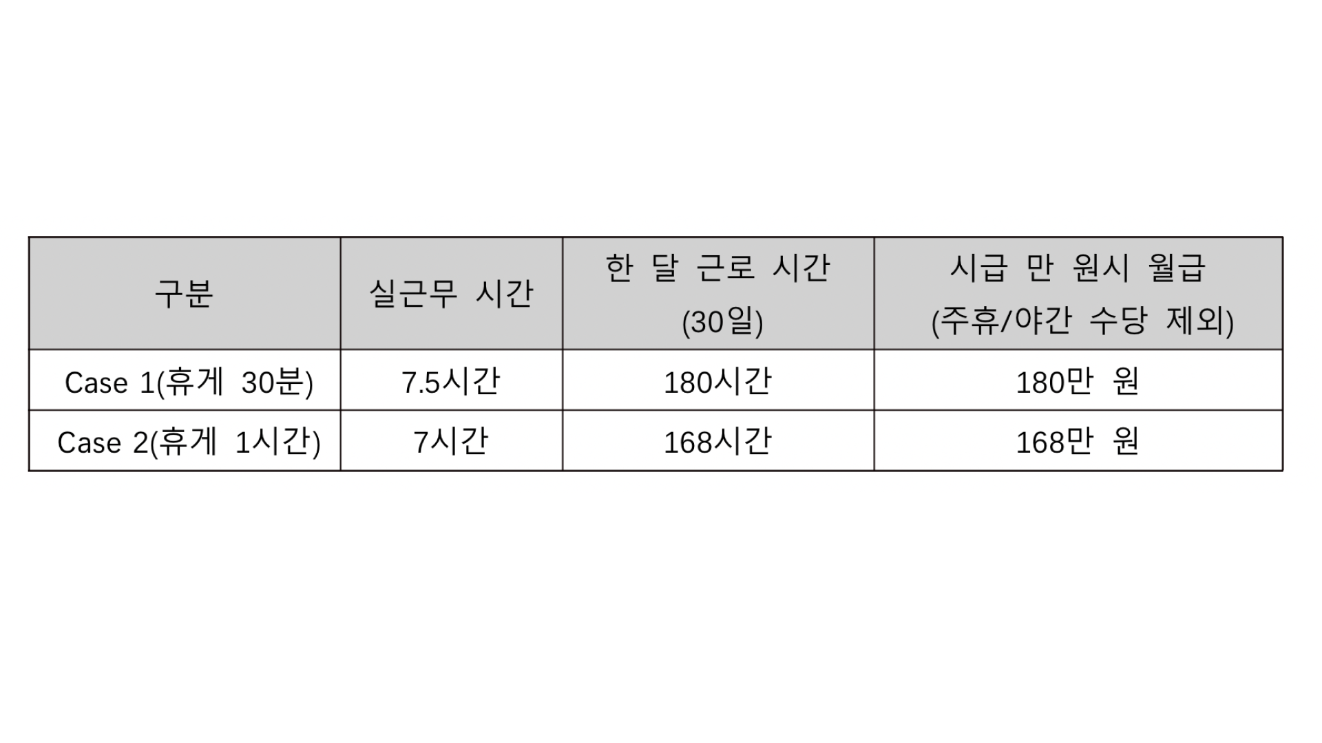 휴게를 얼마나 넣느냐에 따라서 “월급”이 차이 나는 것을 알 수 있다.