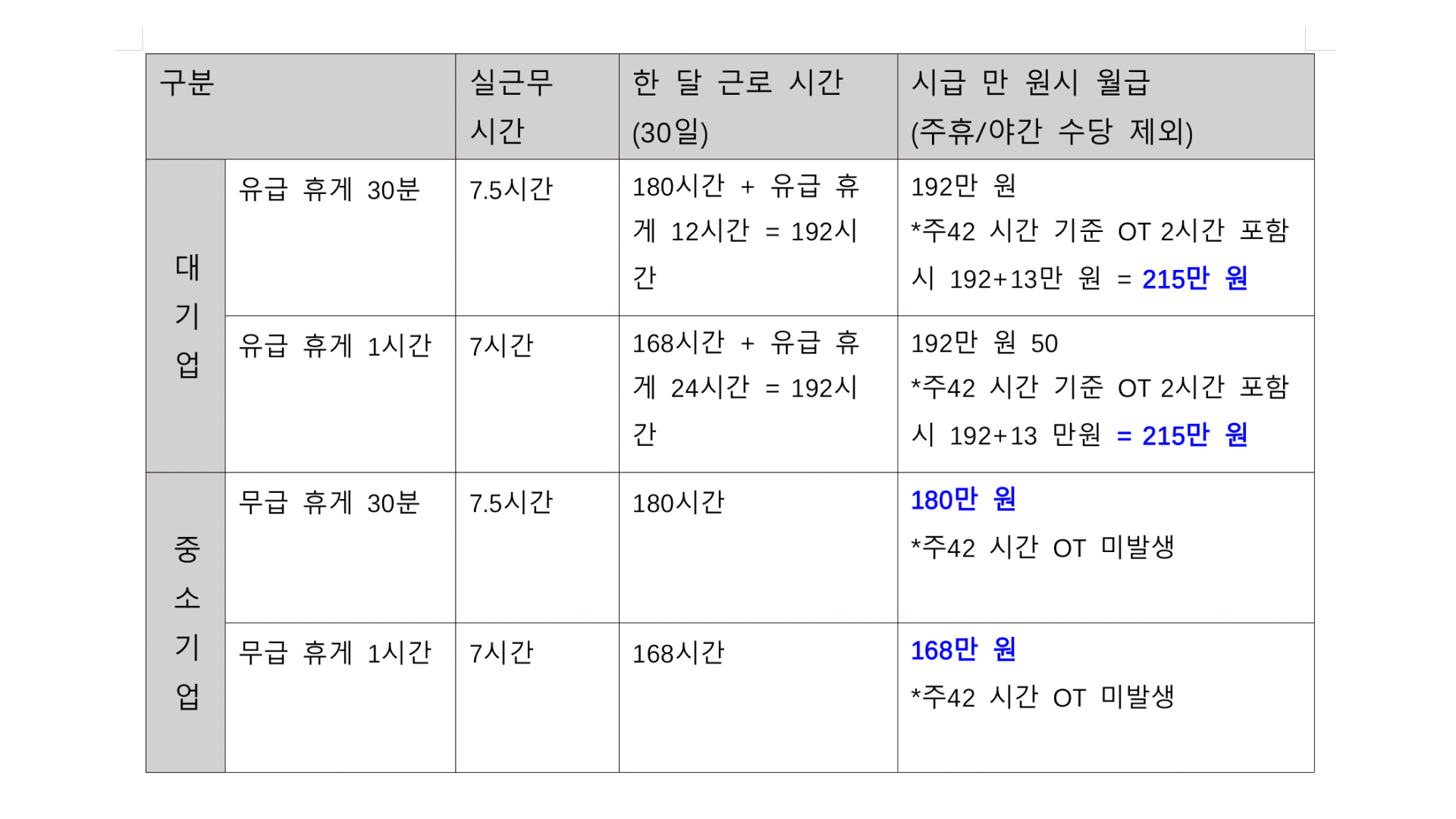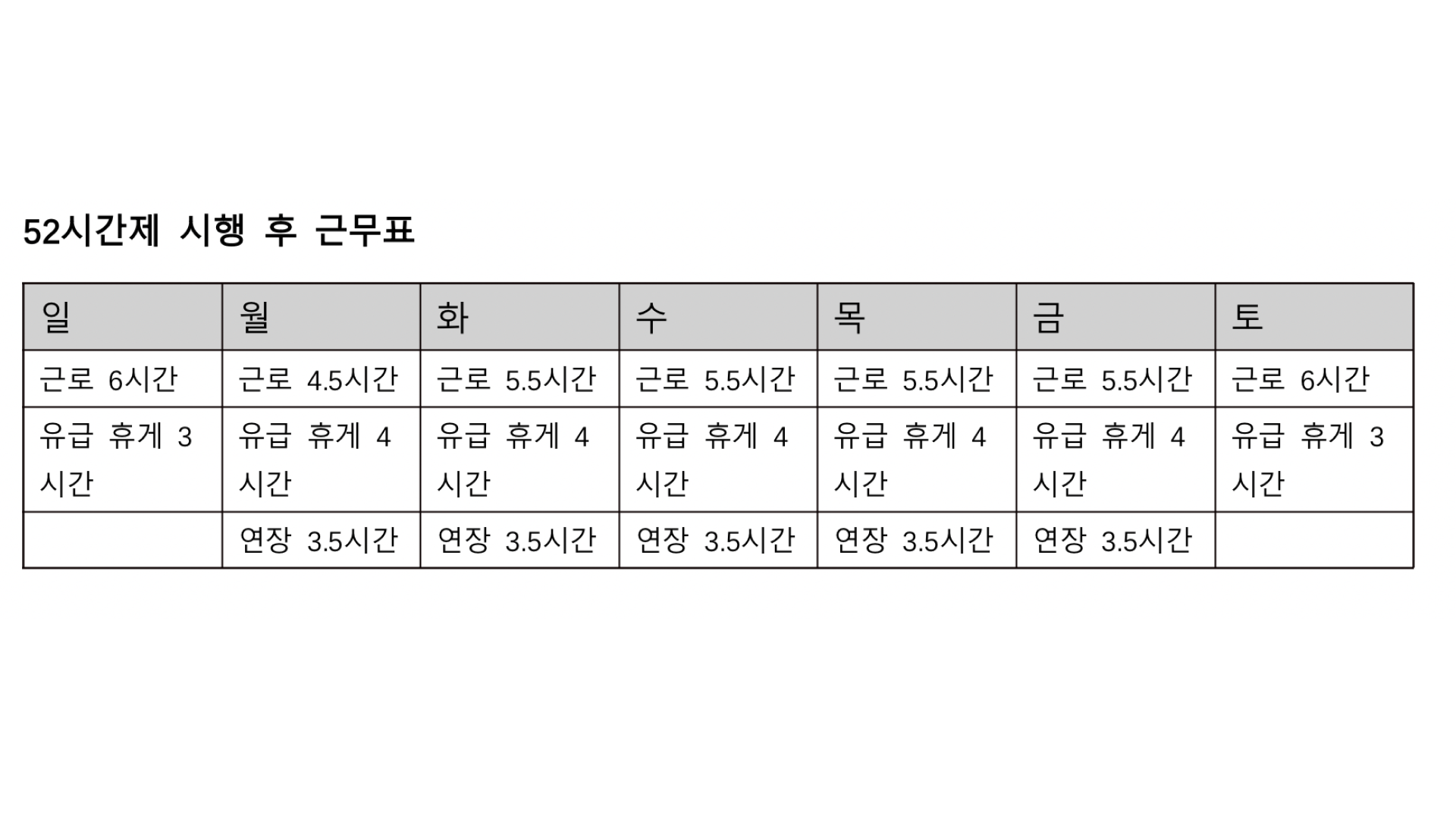 눈치가 빠른 사람이면 알겠지만, 무급휴가는 당연히 근로 시간에서 제외고 유급 휴게 또한 돈은 주지만 주 52시간을 산정할 때 따지는 근로 시간에서 제외된다는 점이다.