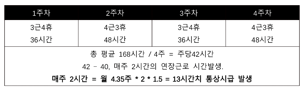 상기 표와같이 4조교대를 시행하게 되면, 통칭 기본 오티로 불리는 시간이 매주 2시간씩 포함되어 월 13시간 정도로 지급되게 된다.