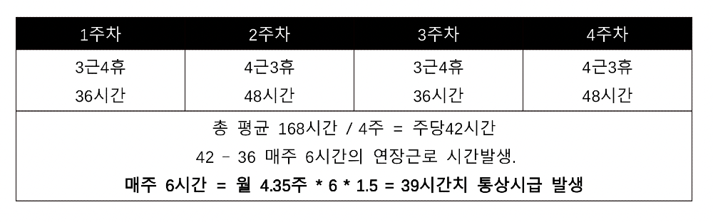 *어차피 교대 방식이 달라도 평균은 똑같으니 계산하기 쉬운 3근4휴 기준으로 보자.