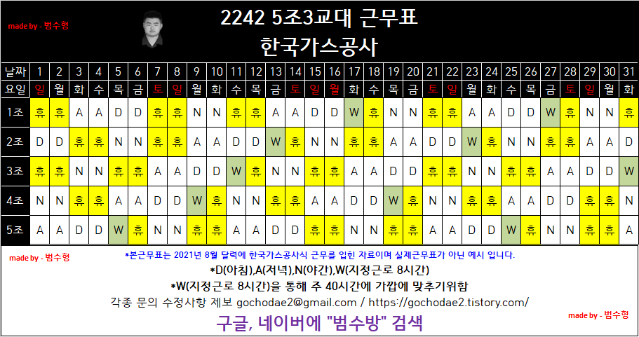 현재의 4조 2교대(3근4휴 4근 삼류)를 기준으로 아래의 근무 테이블 표를 봐보자.