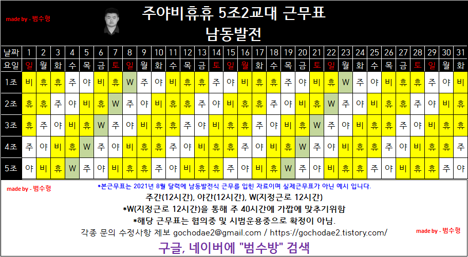 36시간제에 가장 걸맞은 근무표는5조2 or 5조 3교대 베이스에 월 지정 근로를 16시간 한다면 완벽하게 들어맞는다고 볼 수 있다.