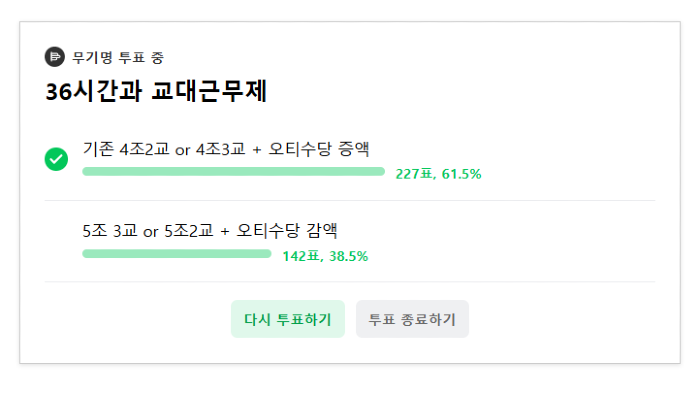 약 400명의 투표 결과는 6대4 정도로 기존 4조 2교대를 유지하고, 수당을 더 받자는 의견으로 조율되고 있다.