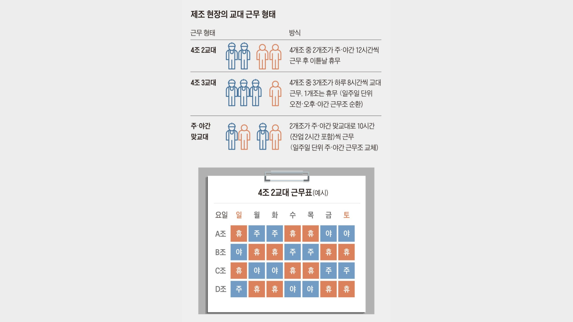 그럼에도 불구하고, 2조 2교대, 3조 2교대 등의 근무 패턴은 피하는 게 좋다는 것이 저의 생각이며, 일부를 제외한 많은 회사가 대세를 따라 4조 2교대를 시행 및 추진하고 있는 것은 참 다행입니다.