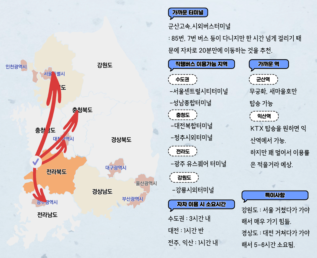 자차 이용 시 수도권까지 3시간, 전주/익산 등 전라도 주요도시 1시간, 대전 1시간 반이 소요됩니다. 전라도에서는 경상도로 바로 가는 도로가 없기에 경상도까지는 5-6시간 소요됩니다. 강원도 또한 서울을 거쳐 가야하기에 경상도와 소요시간이 엇비슷합니다.