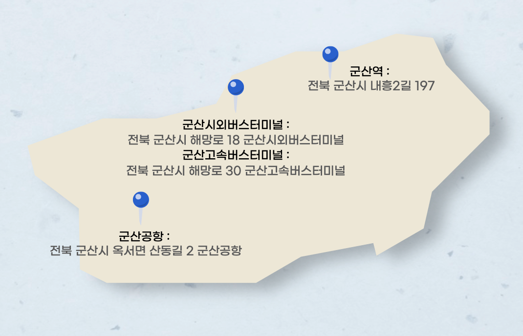 기차역의 경우 군산역을 주로 이용하고, KTX와 SRT를 이용할 경우 익산역을 이용합니다. 하지만 거리가 꽤 멀어 이용률이 높진 않을 것으로 예상됩니다.