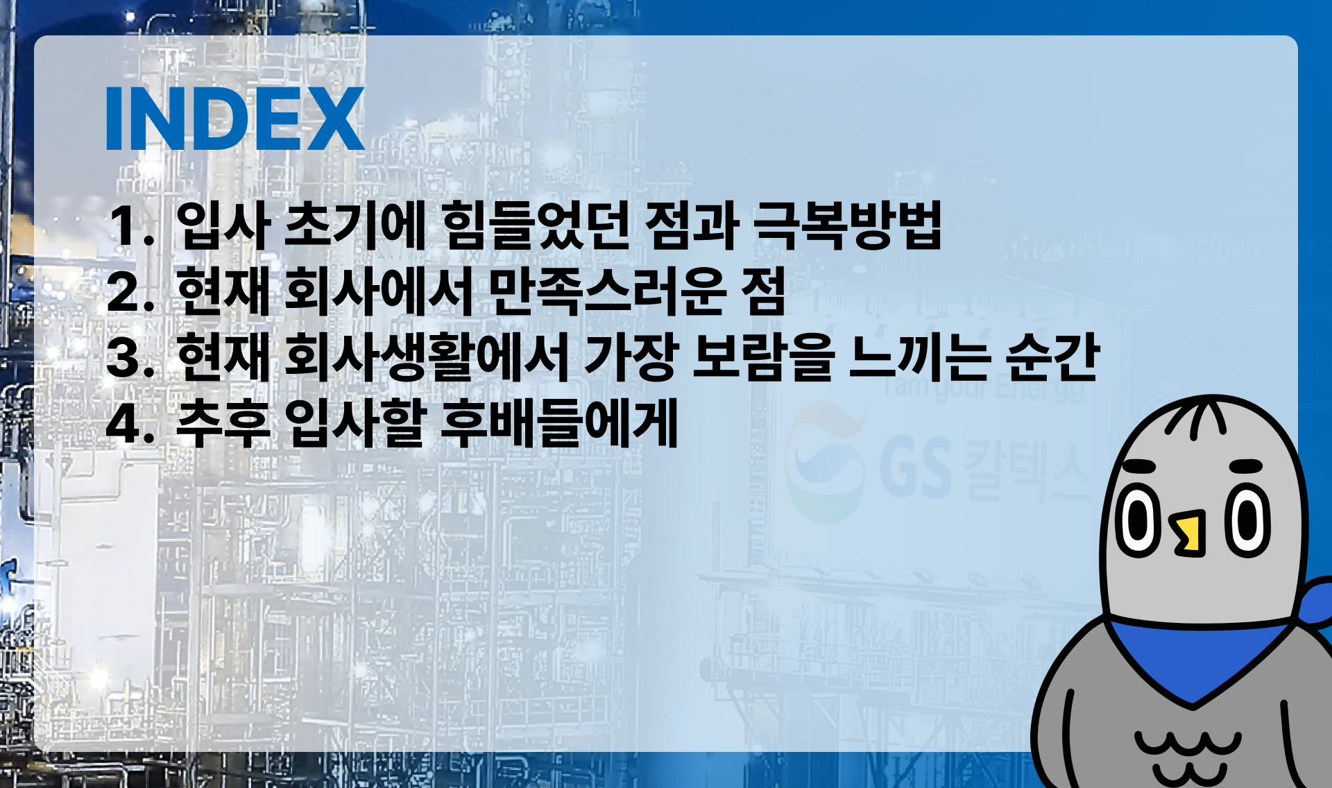 🕊️ 닭둘기: 마지막으로 GS칼텍스 입사를 꿈꾸는 후배들에게 꼭 해주고 싶은 조언이 있다면요?
