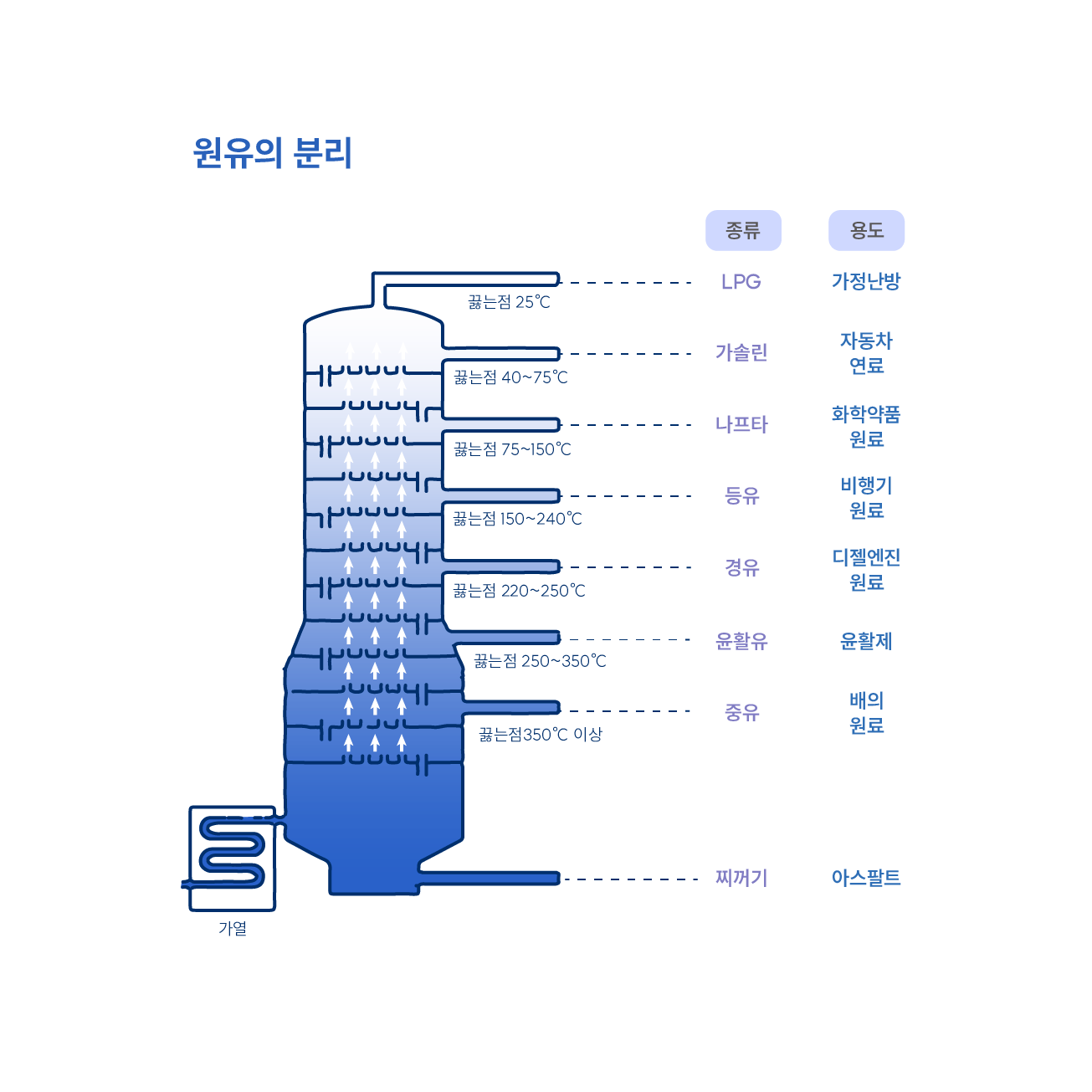 • 증류 : 원유의 끓는 점을 이용하여 제품을 원유로부터 분리하는 과정