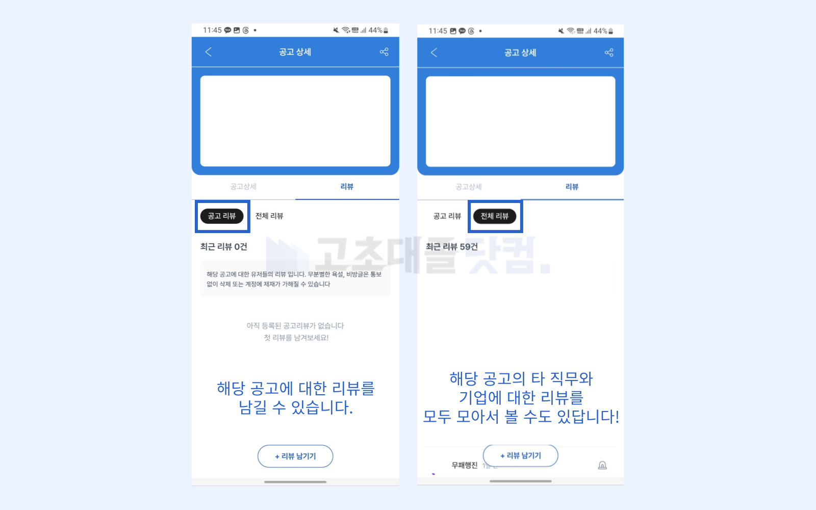 공고 리뷰에선 해당 공고에 대한 리뷰만을 볼 수도 있고, 해당 공고의 타 직무와 기업에 대한 리뷰는 전체 리뷰에서 확인 가능합니다!