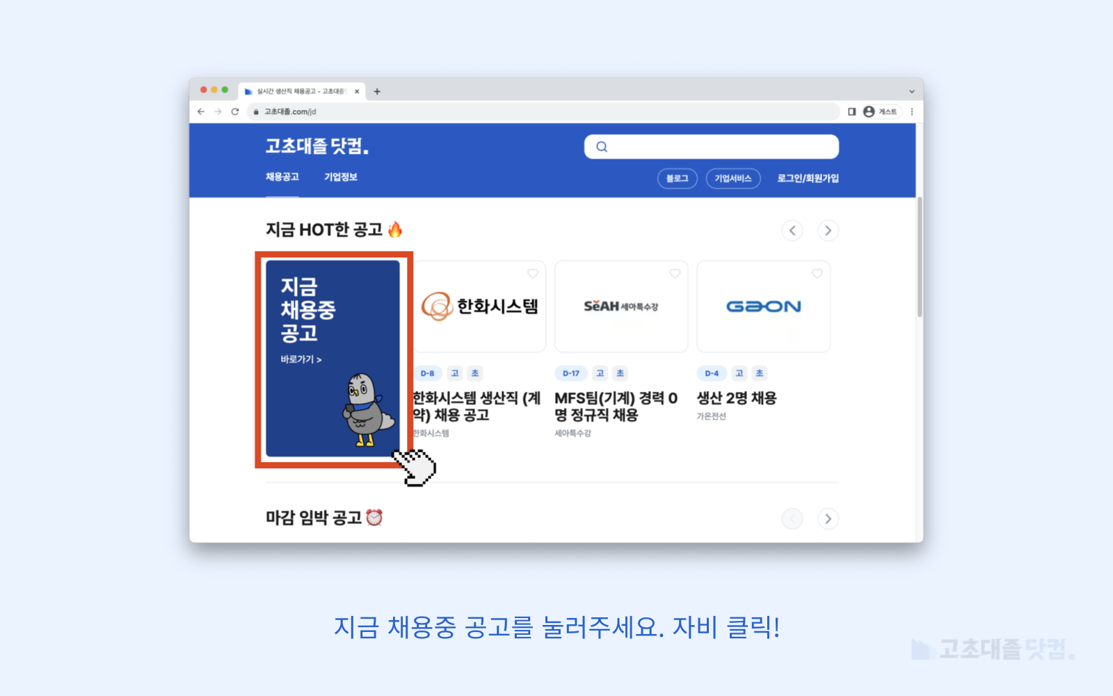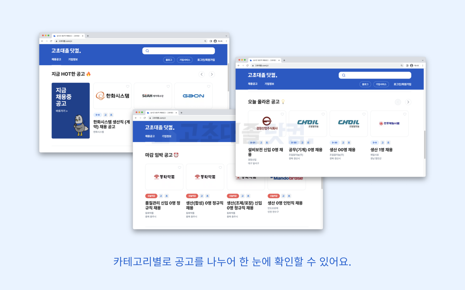 공고 역시 HOT공고, 마감임박 공고 등 다양한 카테고리로 나누어 유저들에게 제공하고 있습니다.