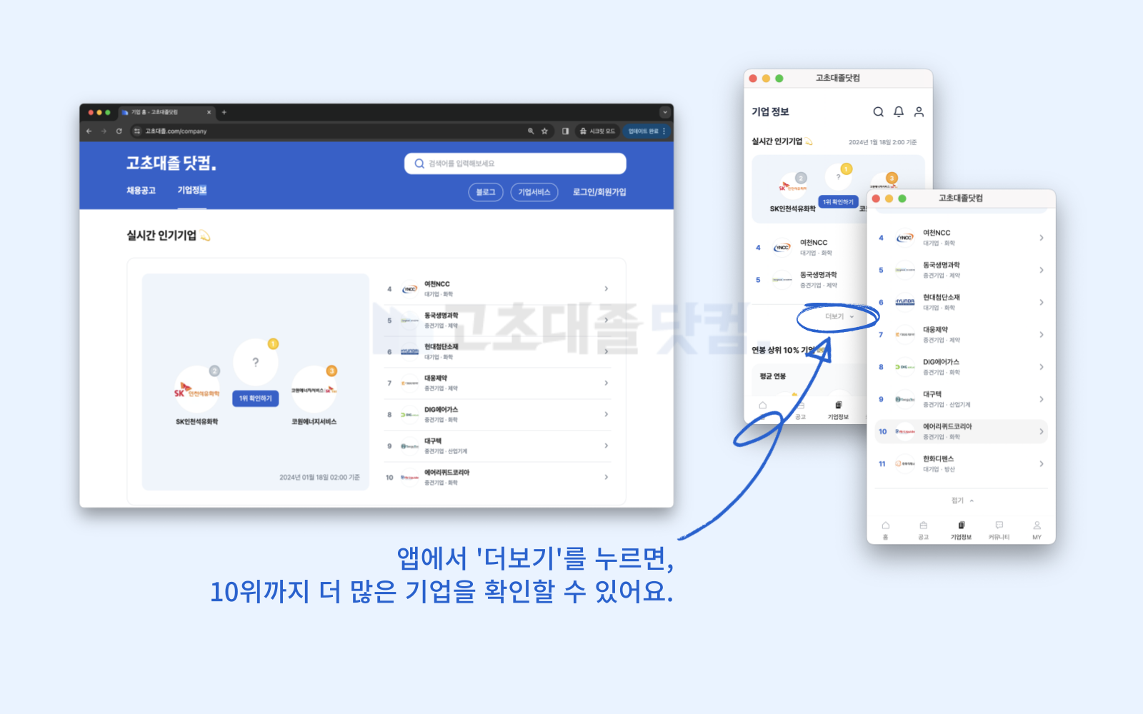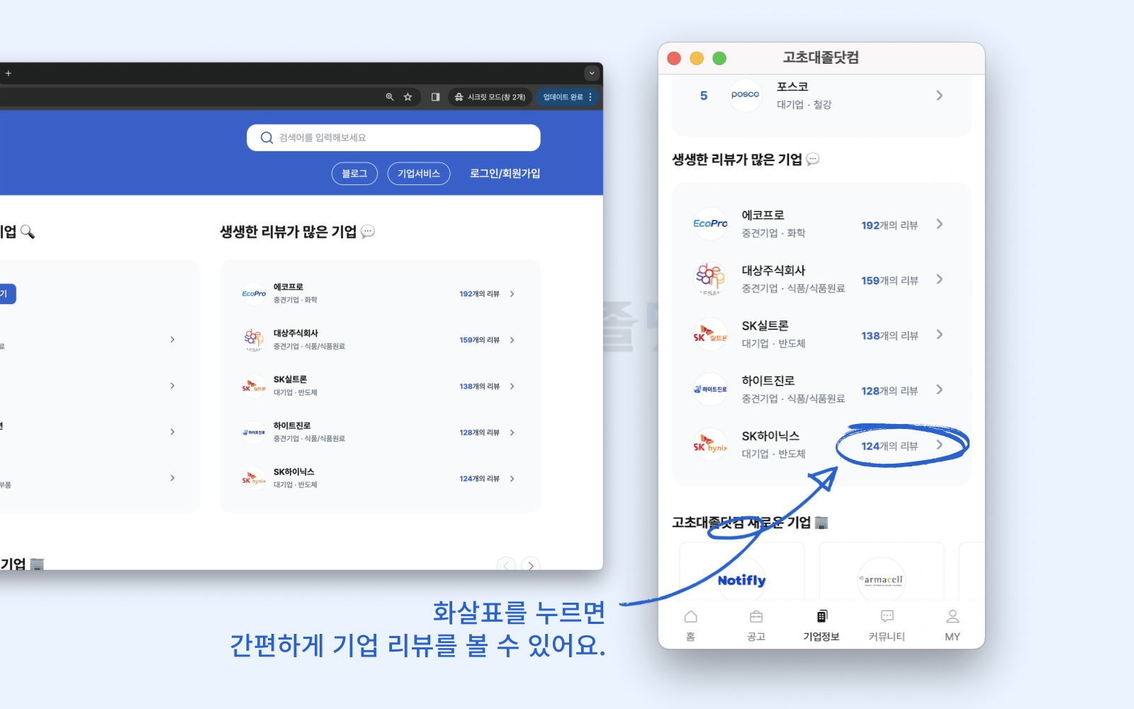 웹과 앱 모두, 기업명 옆의 화살표를 누르면 바로 리뷰를 보러갈 수 있습니다.