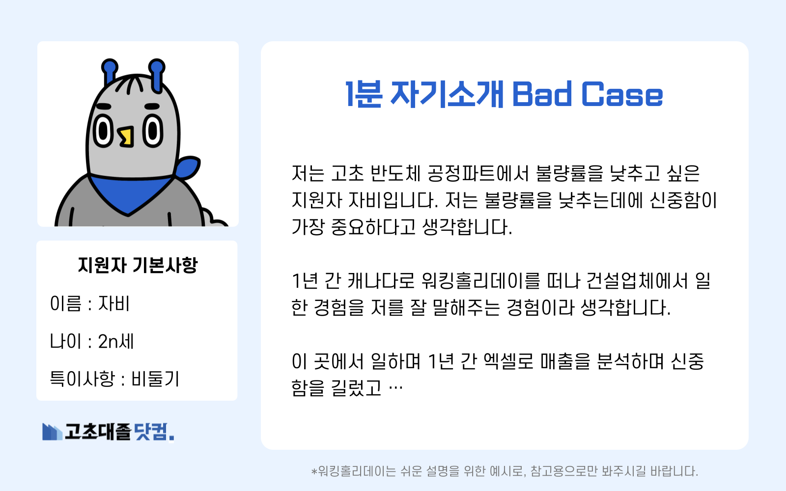 또한 본격적인 면접 전 모든 지원자들에게 공평하게 말할 기회를 주는 시간이기도 합니다. 1분 자기소개는 모든 이에게 주어지는 기회이기 때문입니다.