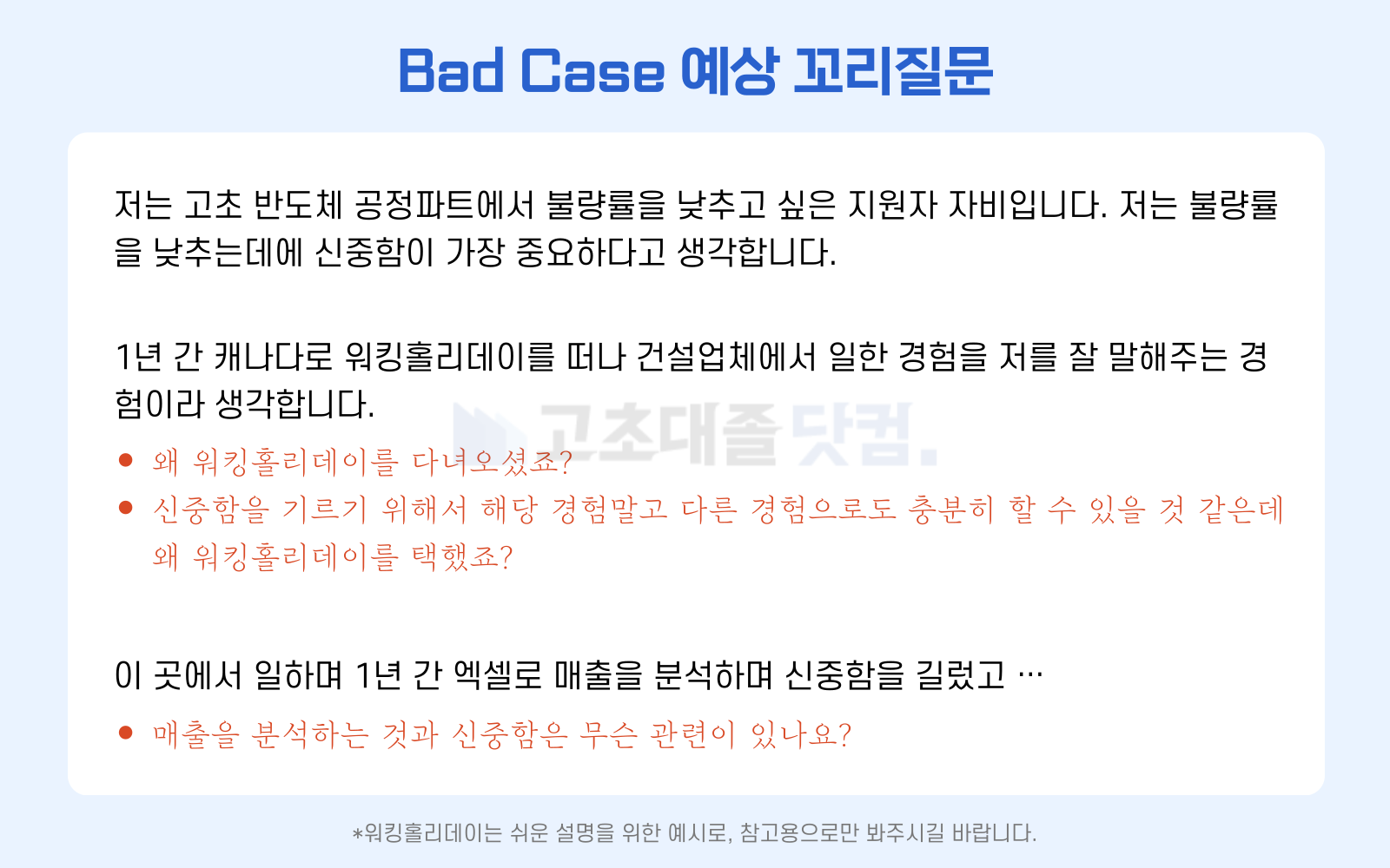 이미 직무와 너무 멀어진 키워드를 던졌기 때문에 면접관은 끊임없이 자비를 증명하는 질문을 던질 것입니다. 그렇게 되면 자신의 직무 경험을 어필 할 수 있는 시간과는 점점 멀어지게 되고, 워킹홀리데이의 함정에 빠지기 쉽습니다.