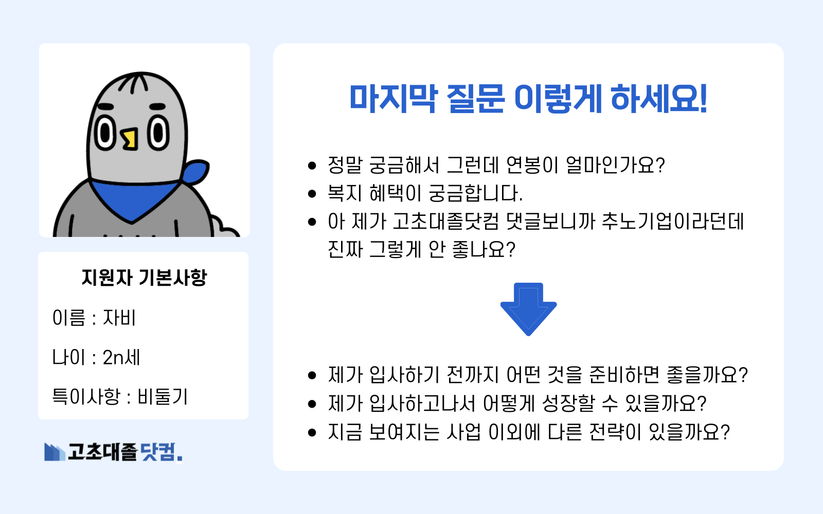 "마지막으로 질문해보세요" 라고 했을 때 당황했던 적 많으시죠? 궁금한게 없는데, 뭘 물어보라는걸까요?