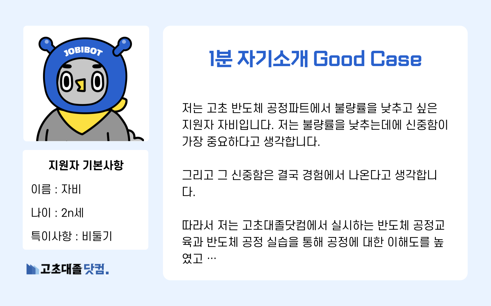 자비가 직접 1분 자기소개를 준비한다 생각하고 예시를 들어보겠습니다. 두 자비는 모두 반도체 공정 직무를 희망하고 있습니다. 그리고 자비는 공정 직무에서 중요한 역량이 신중함이라고 생각하고 있습니다.