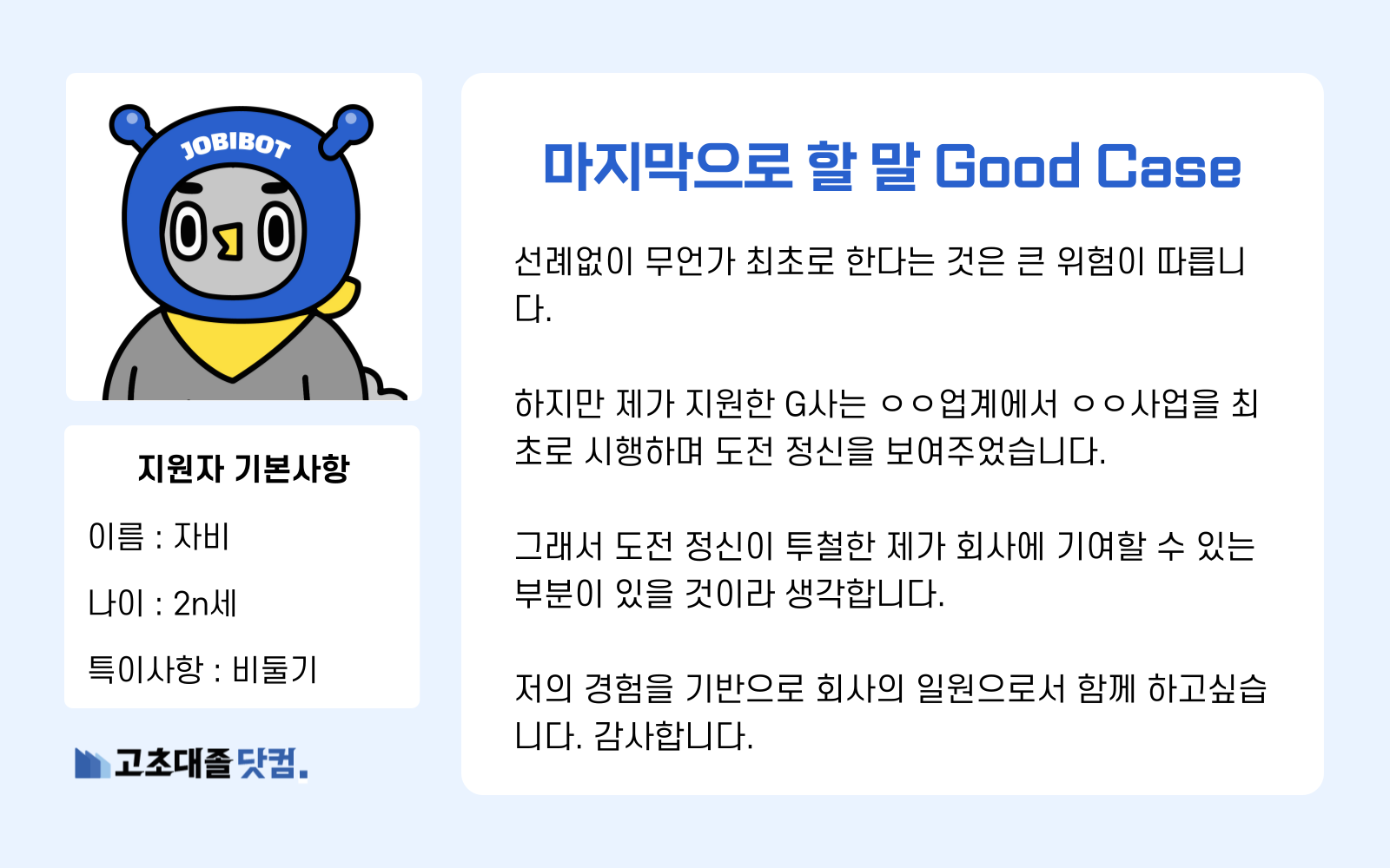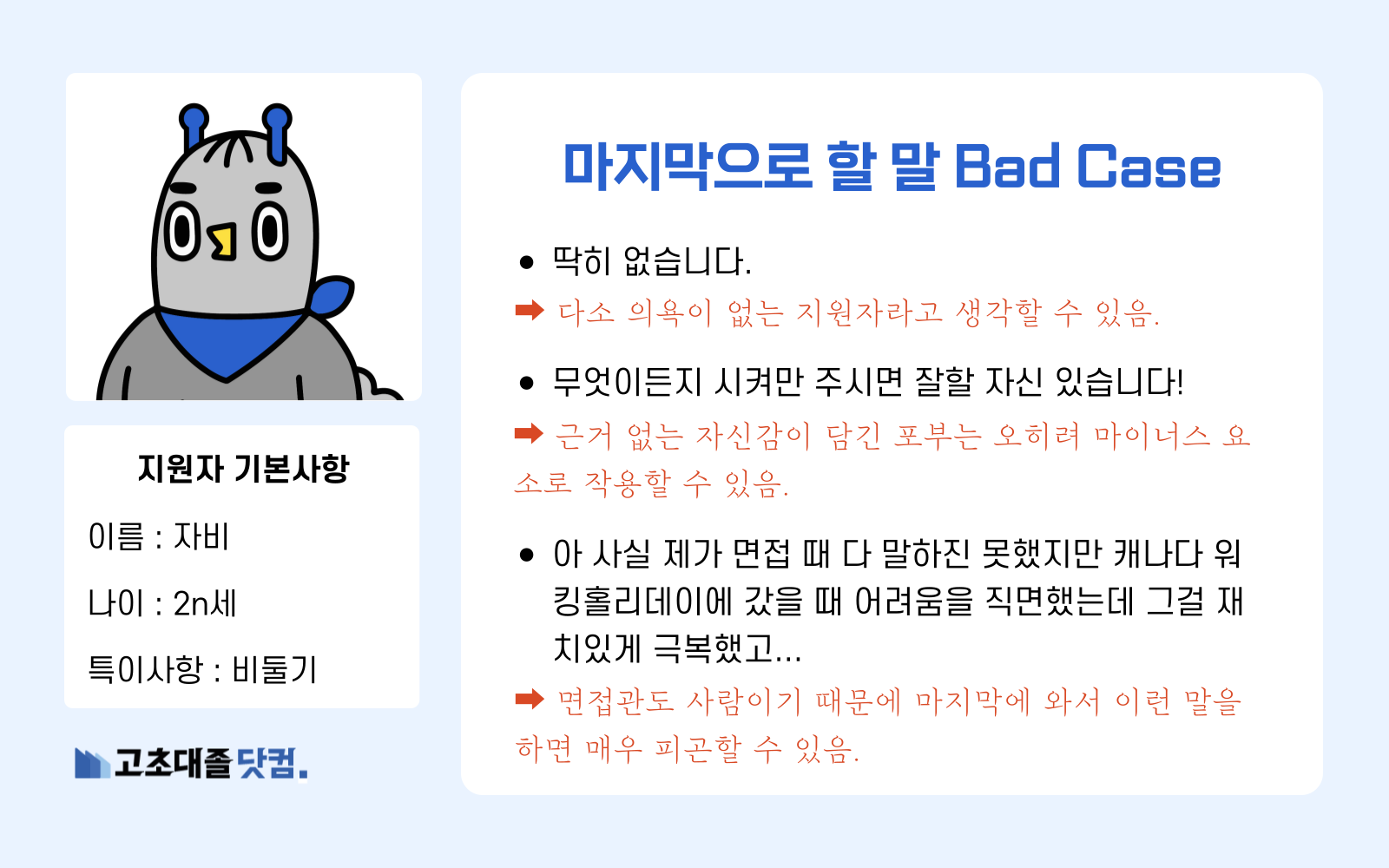 3번 타입은 지원자들이 가장 많이 하는 실수입니다. 마지막 할 말은 말 그대로 "맺음말"입니다. 하지만 3번 타입의 답변을 하는 순간 면접은 원점으로 돌아갑니다. "갑자기 뜬금없이 이런 말을? 맥락을 못 집고 눈치가 없는 사람이군." 라고 생각할 확률이 높습니다.