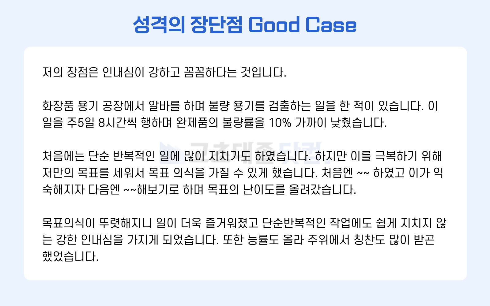 예시의 지원자는 본인의 직무에 맞게 인내심과 꼼꼼함을 장점으로 들었습니다.