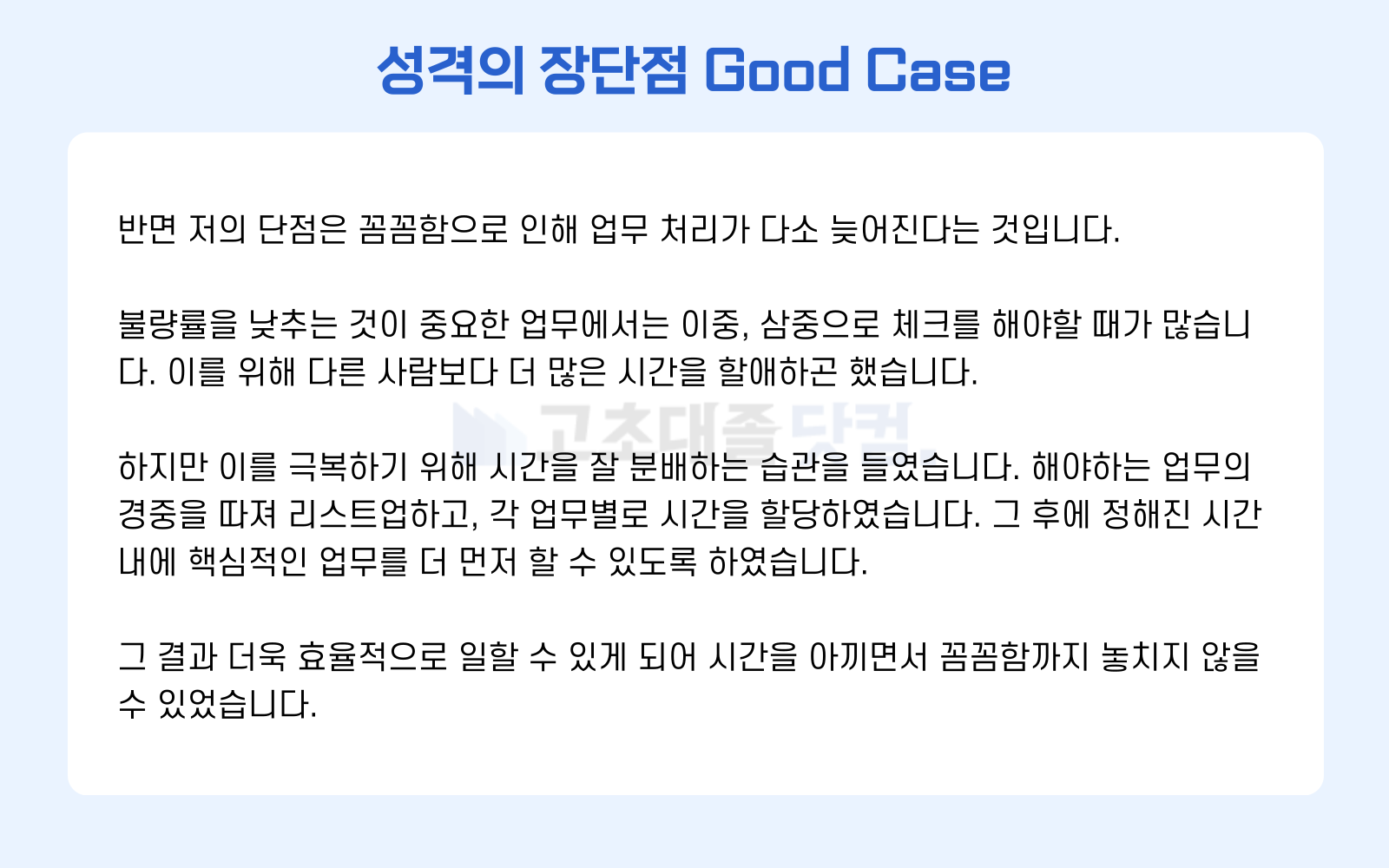 단점을 언급할 시엔 장점이 과해서 단점으로 나타나는 경우를 언급해주면 연결성이 생겨 좋습니다. 그리고 단점은 꼭 본인이 어떻게 극복하였는지도 언급해주세요!