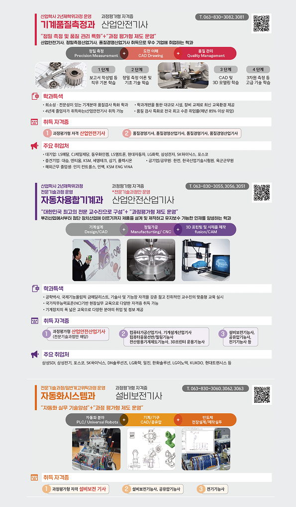 | 기계품질측정과(학위) | 산업안전기사 | 자동차, 배터리, 반도체 부품 정밀측정 전문가 양성 |