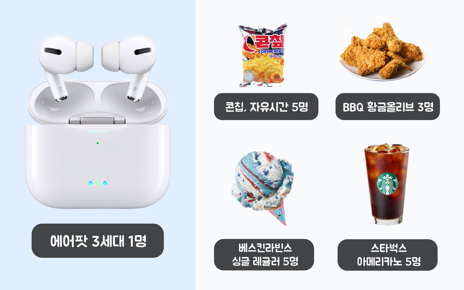 에어팟 3세대, BBQ 황금 올리브, 스타벅스 아메리카노, 베스킨라빈스 아이스크림 등 다양한 경품을 드려요!