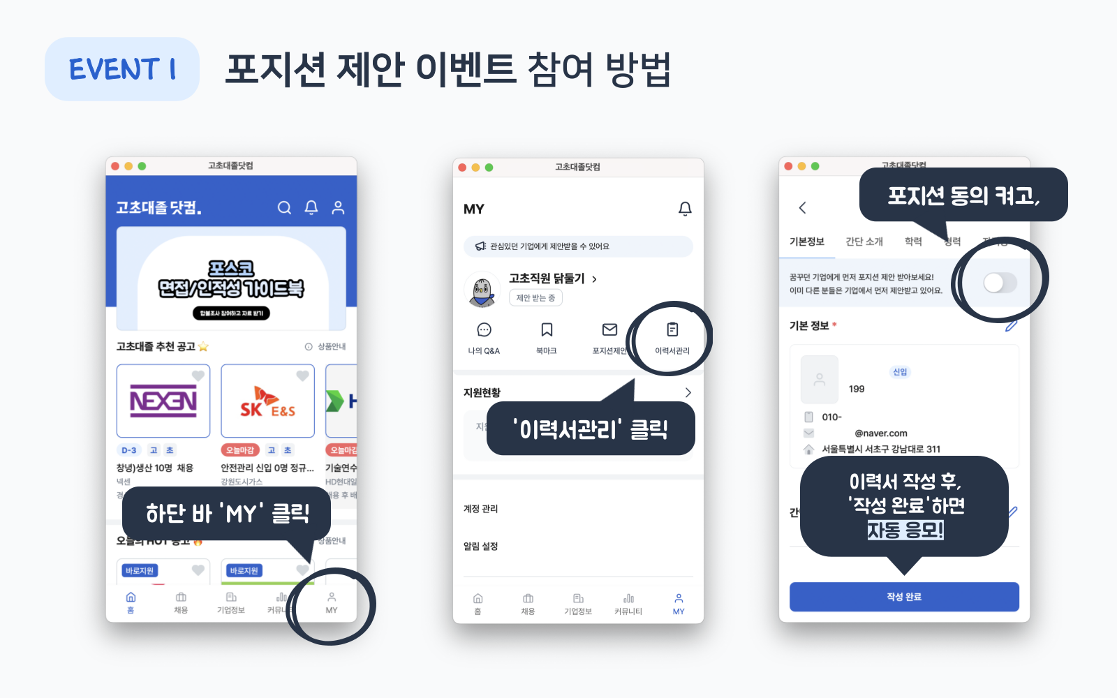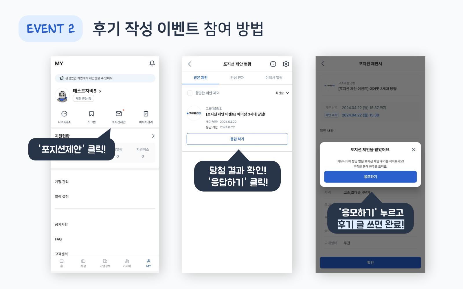 • 글 제목 말머리로 [포지션 제안 이벤트] 달고, 사진과 함께 후기 작성하면 완료!