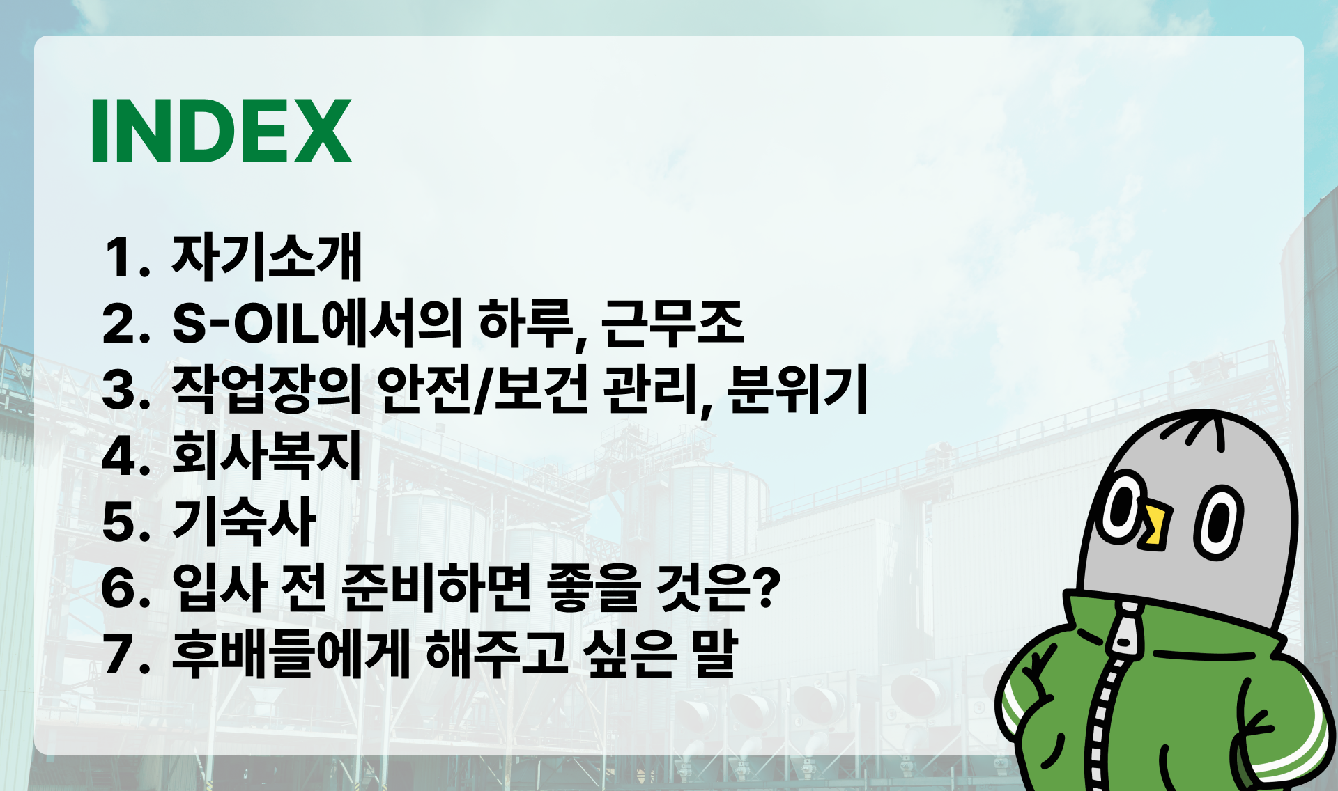 ⛽️ 뿌셔 : 안녕하세요. S-OIL 생산직 오퍼레이터로 근무하고 있는 뿌셔입니다.