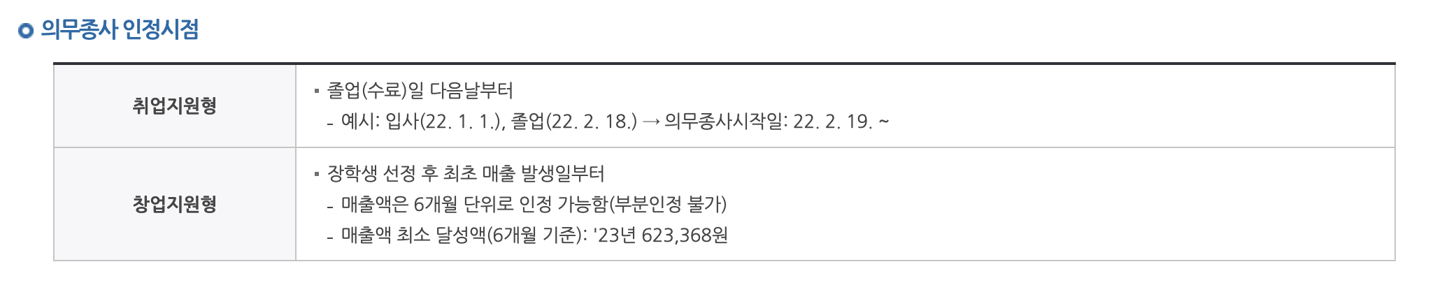 또한 창업지원형은 선정 된날부터 행한 의무종사를 인정해줍니다. 만약 장학금 선정을 2023년 11월 1일에 확정 받았다고 합시다. 그리고 수혜는 1년을 받았다고 해봅시다.
