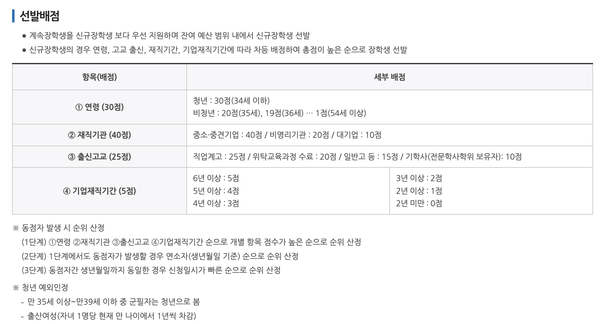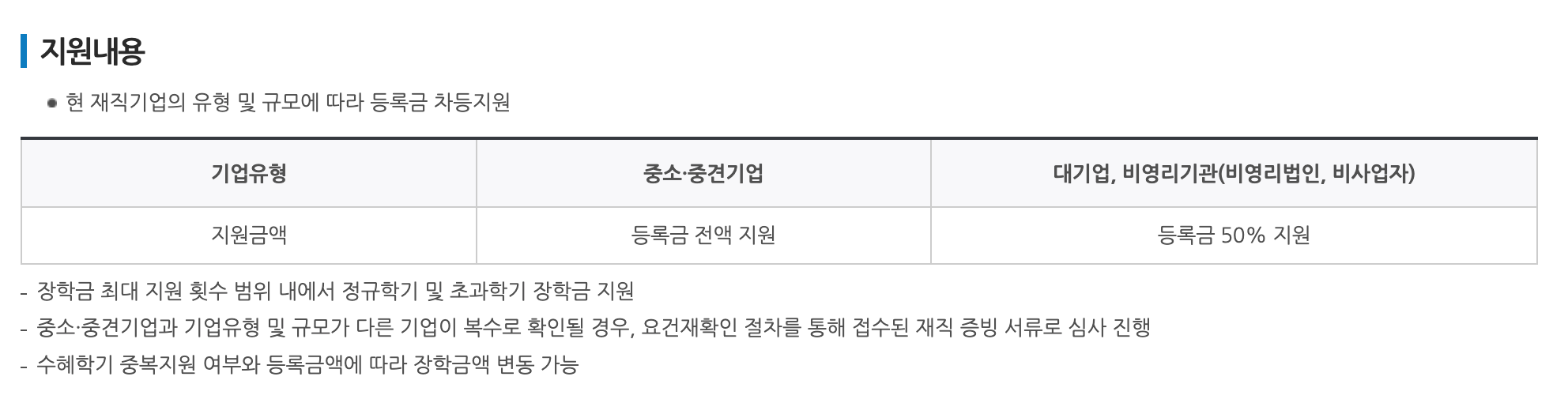 - 재직요건 : 고등학교 졸업자로서 산업체 재직기간이 2년 이상이며(중소중견기업은 1년이상), 현재 지원대상 기업에 재직중인 자