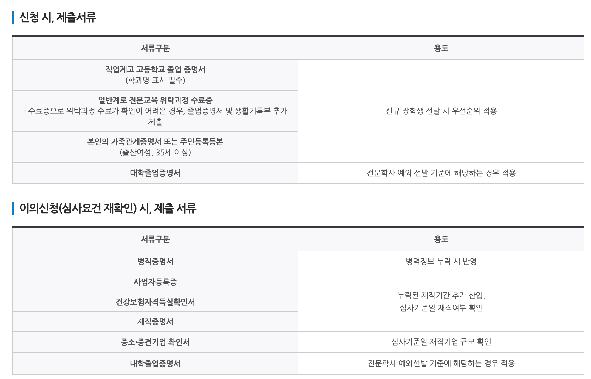 - 최종학력 : 고등학교 졸업자(전문학사 이상은 지원 불가, 단 전문학사 취득 전 재직경력이 2년 이상이고 전공심화과정, 4년제 편입 시 지원 가능)