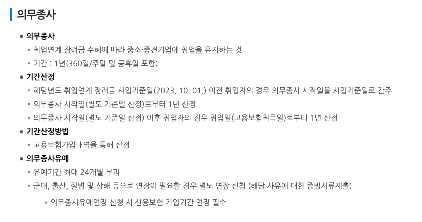 해당 장려금 또한 의무종사를 이행해야합니다. 장려금을 받을 시 1년(360일/주말 및 공휴일 포함)동안 취업 상태를 유지해야합니다.