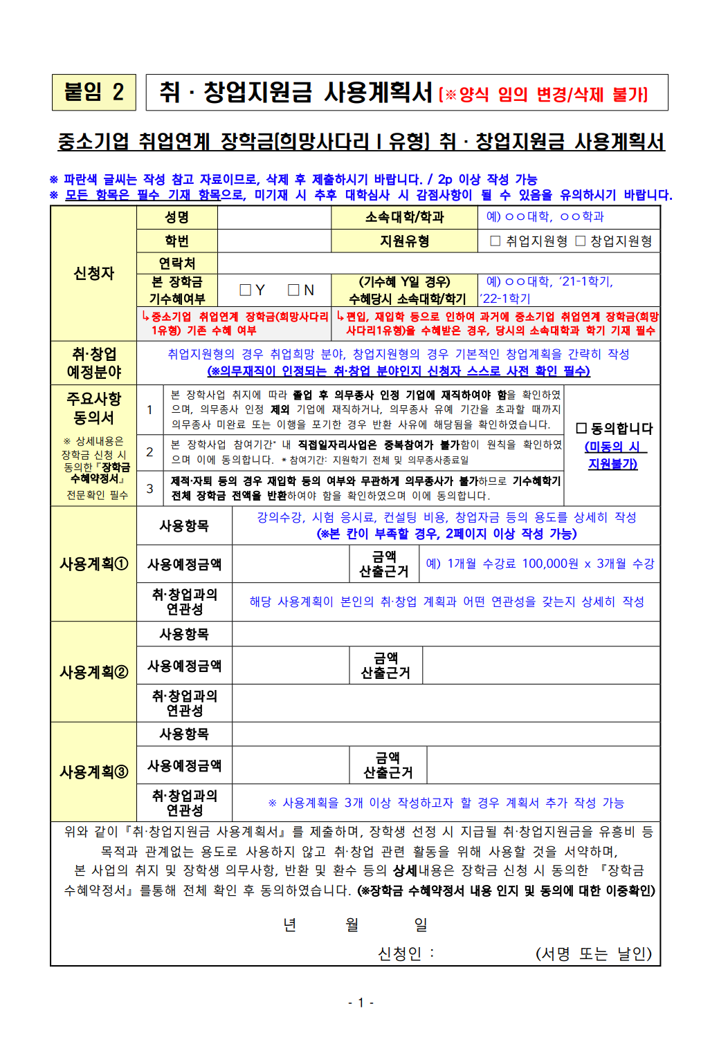 지원을 하기 위해선 취업•창업 준비 계획서를 써야합니다. 해당 양식은 한국장학재단에서 다운 받으실 수 있습니다.