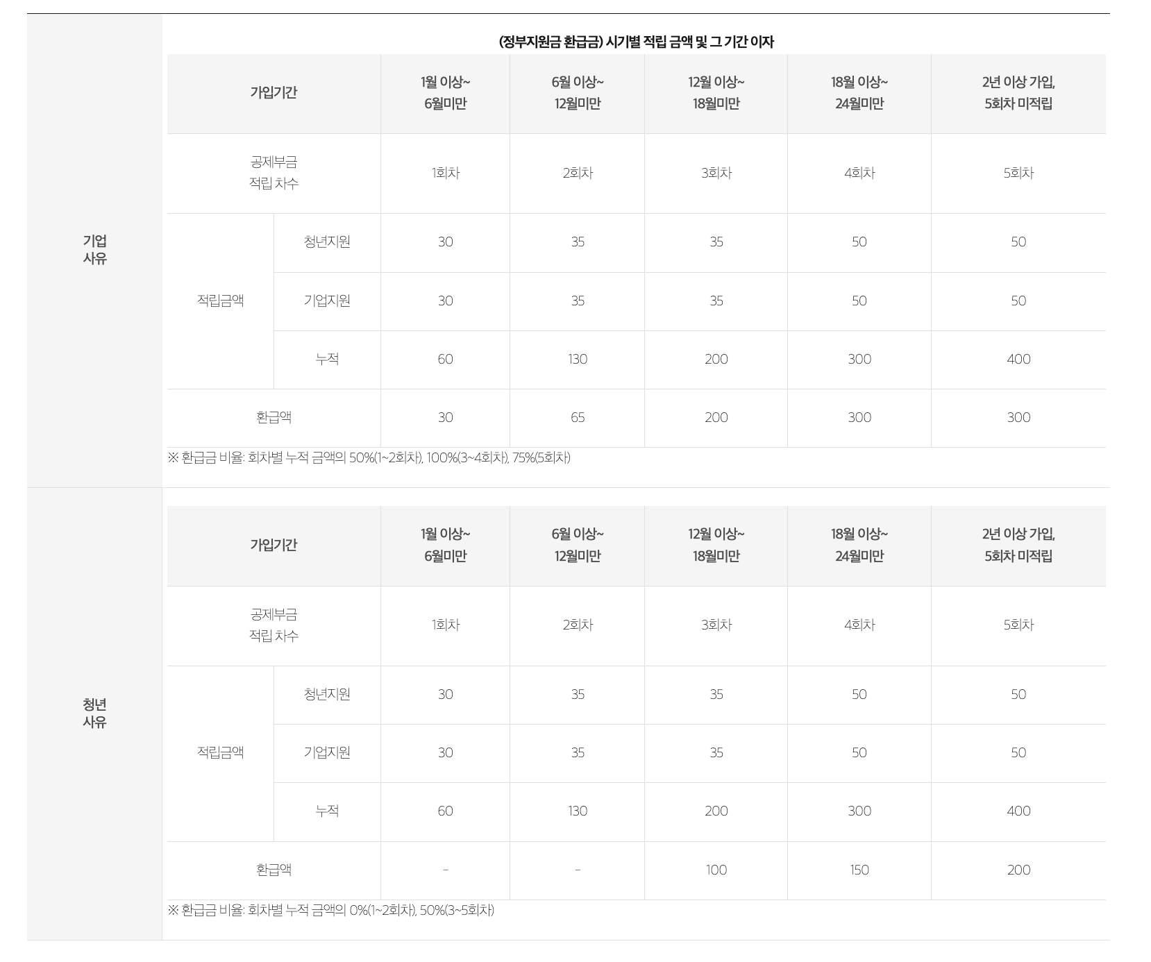 - 정부 : 60만원, 70만원, 70만원, 100만원, 100만원을 6개월 단위로 적립