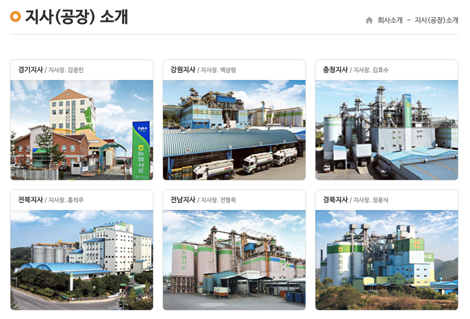 농협사료는 경기지사, 강원지사, 충청지사, 전북지사, 전남지사, 경북지사, 경남지사, 울산지사, 원주공장, 경주공장, 군산바이오, 부산바이오, NH-HAY, 농협티엠알 등 전국 12개 지사(공장)을 운영하고 있습니다.