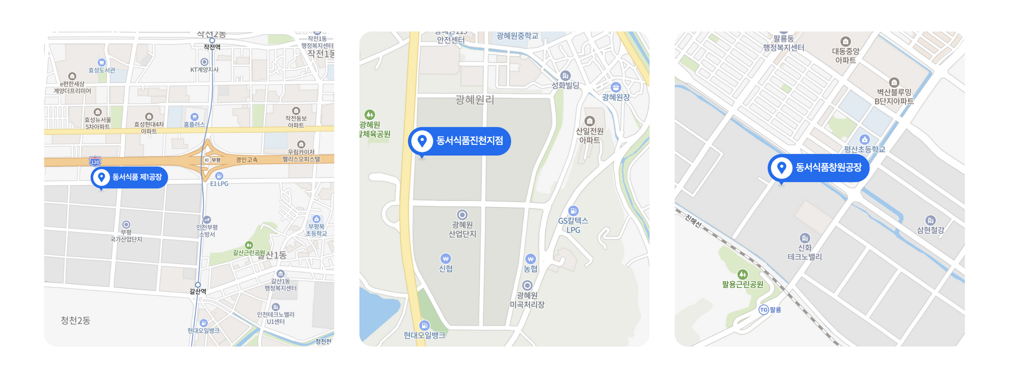 동서식품은 인천 부평구, 충북 진천군, 경남 창원시에 공장을 두고 있습니다.