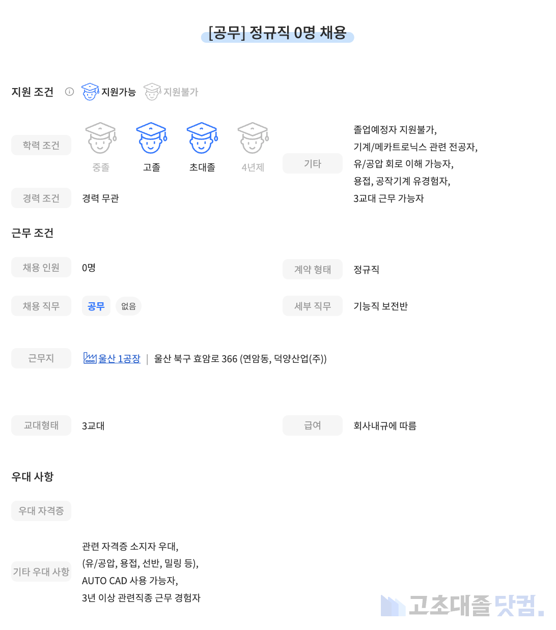 [덕양산업] 기능직 보전반 0명 정규직 채용