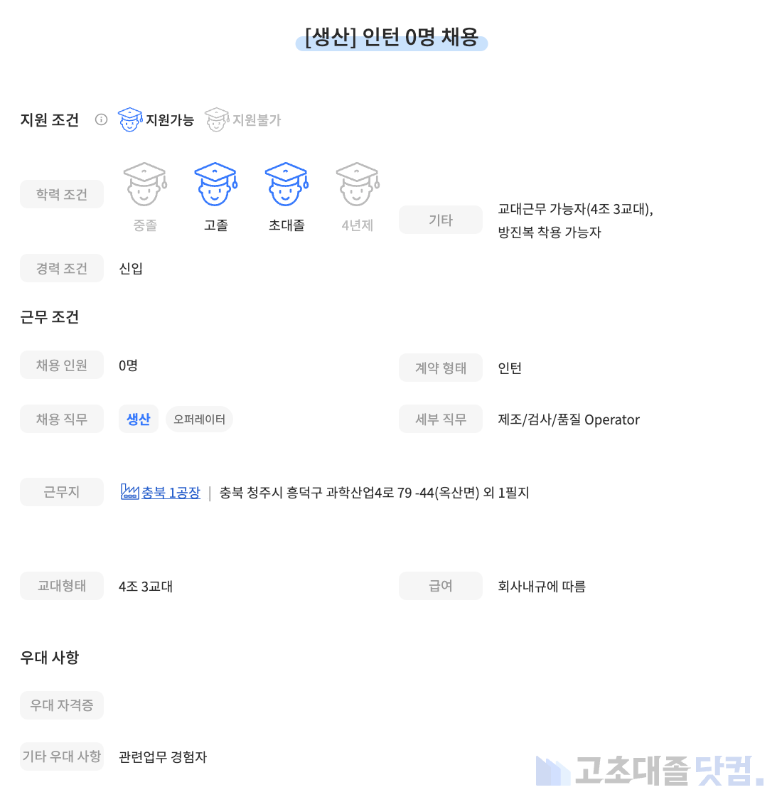 [스템코(주)] 생산 OP 신입 0명 인턴직 채용