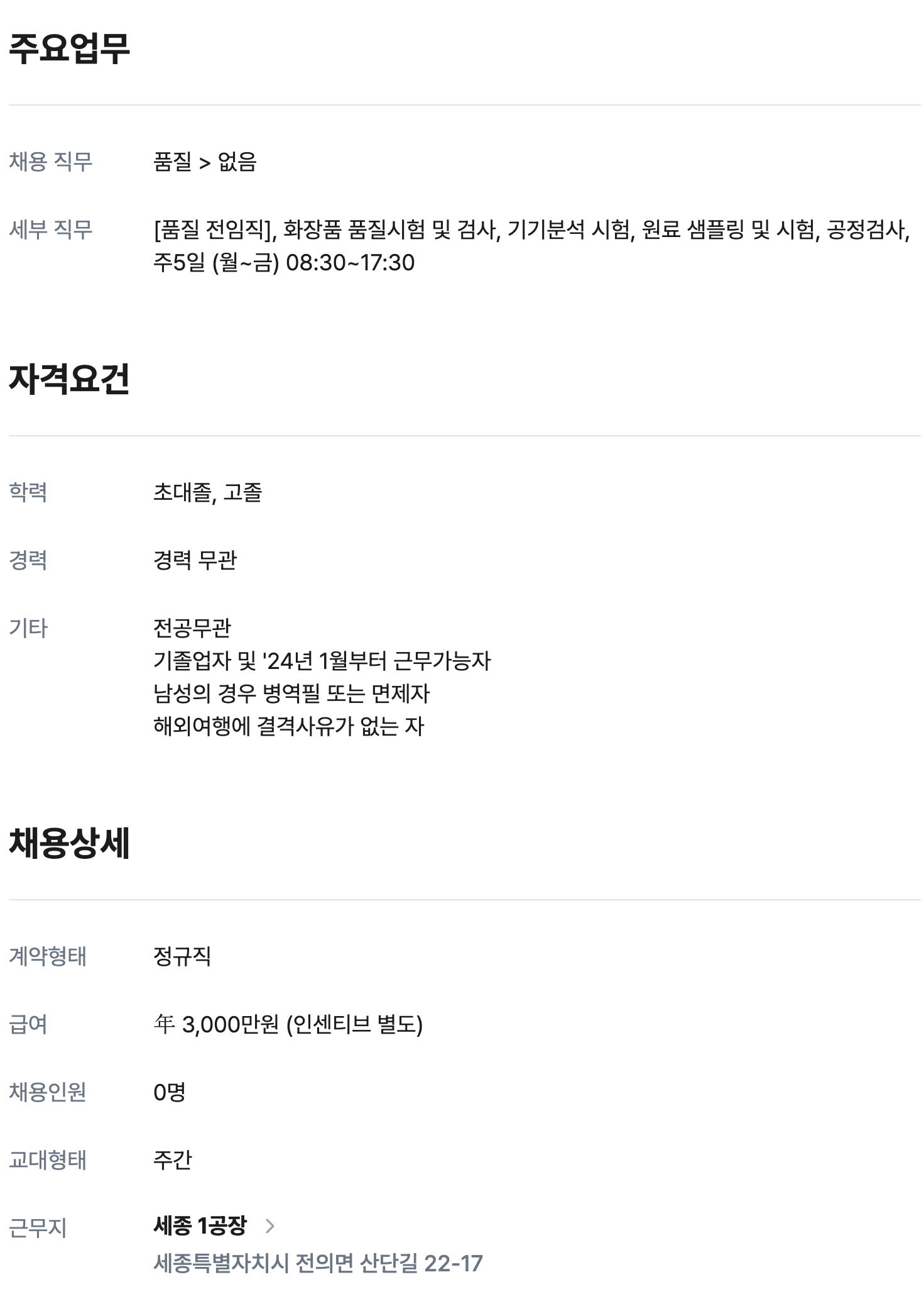 품질 전임직 0명 정규직 채용