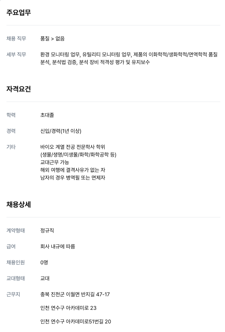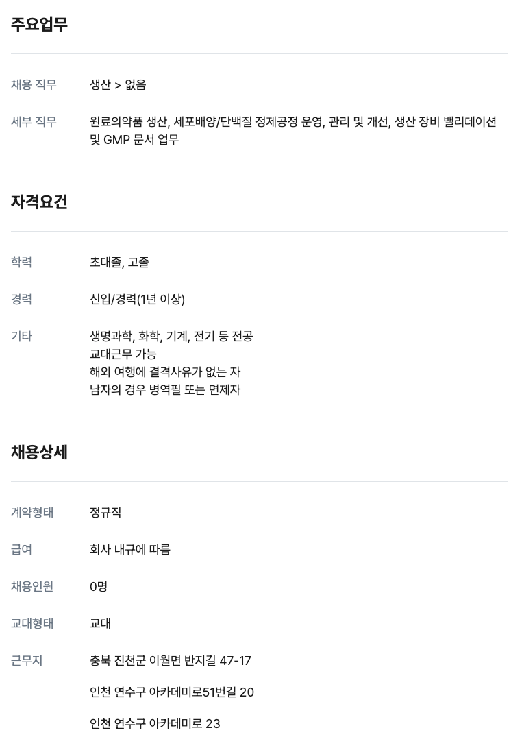 원료의약품 정제/배양 신입 및 경력 0명 정규직 채용