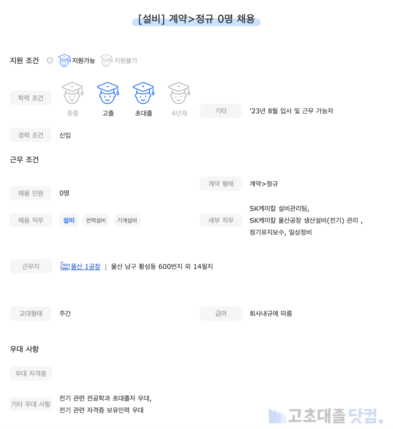 [SK하이이엔지] 환경설비 0명 정규직 채용