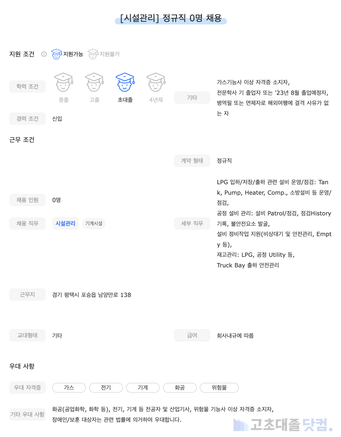 [SK가스] 기지운영원 신입 0명 정규직 채용
