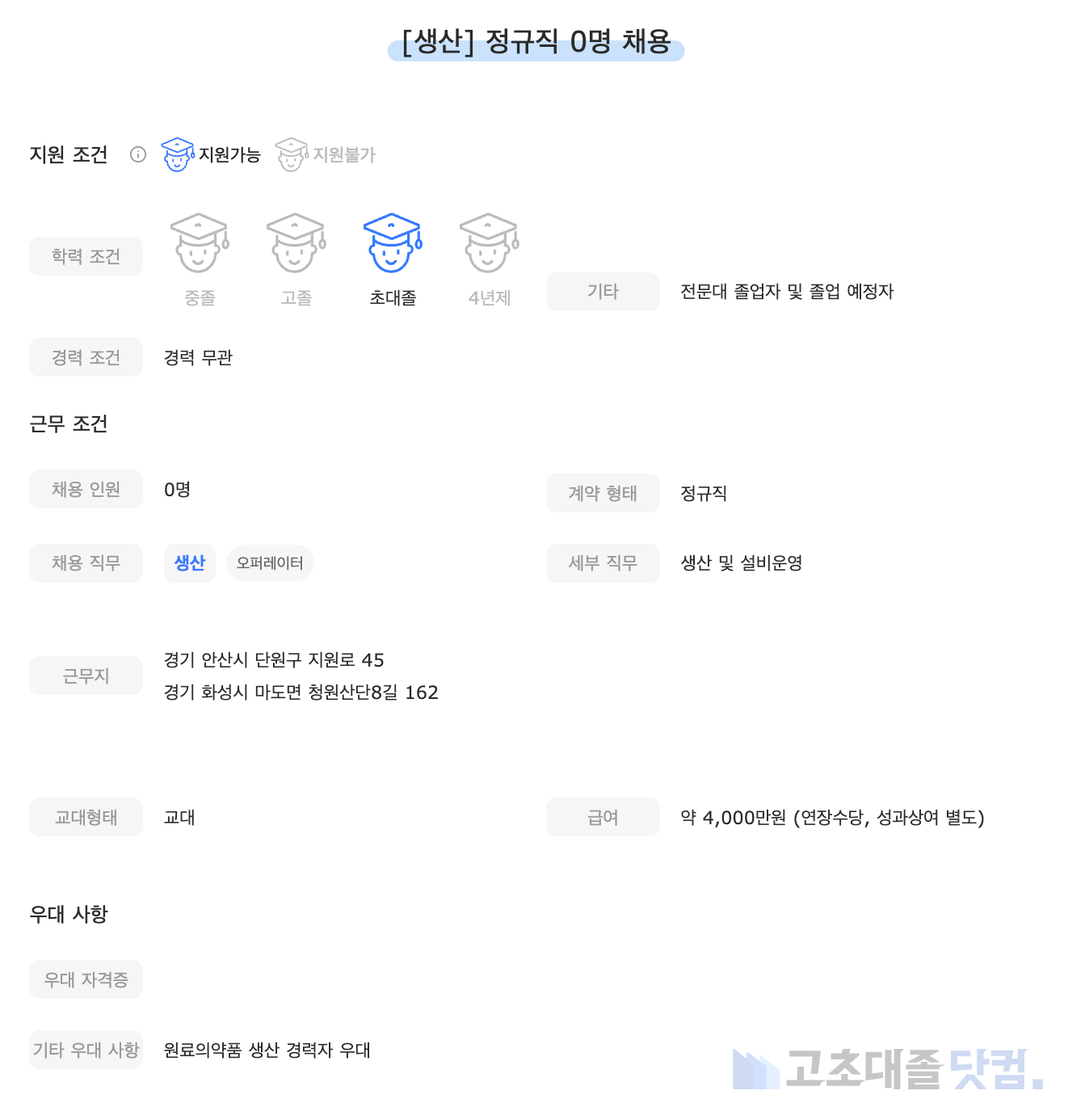 [유한화학] 생산 0명 정규직 채용