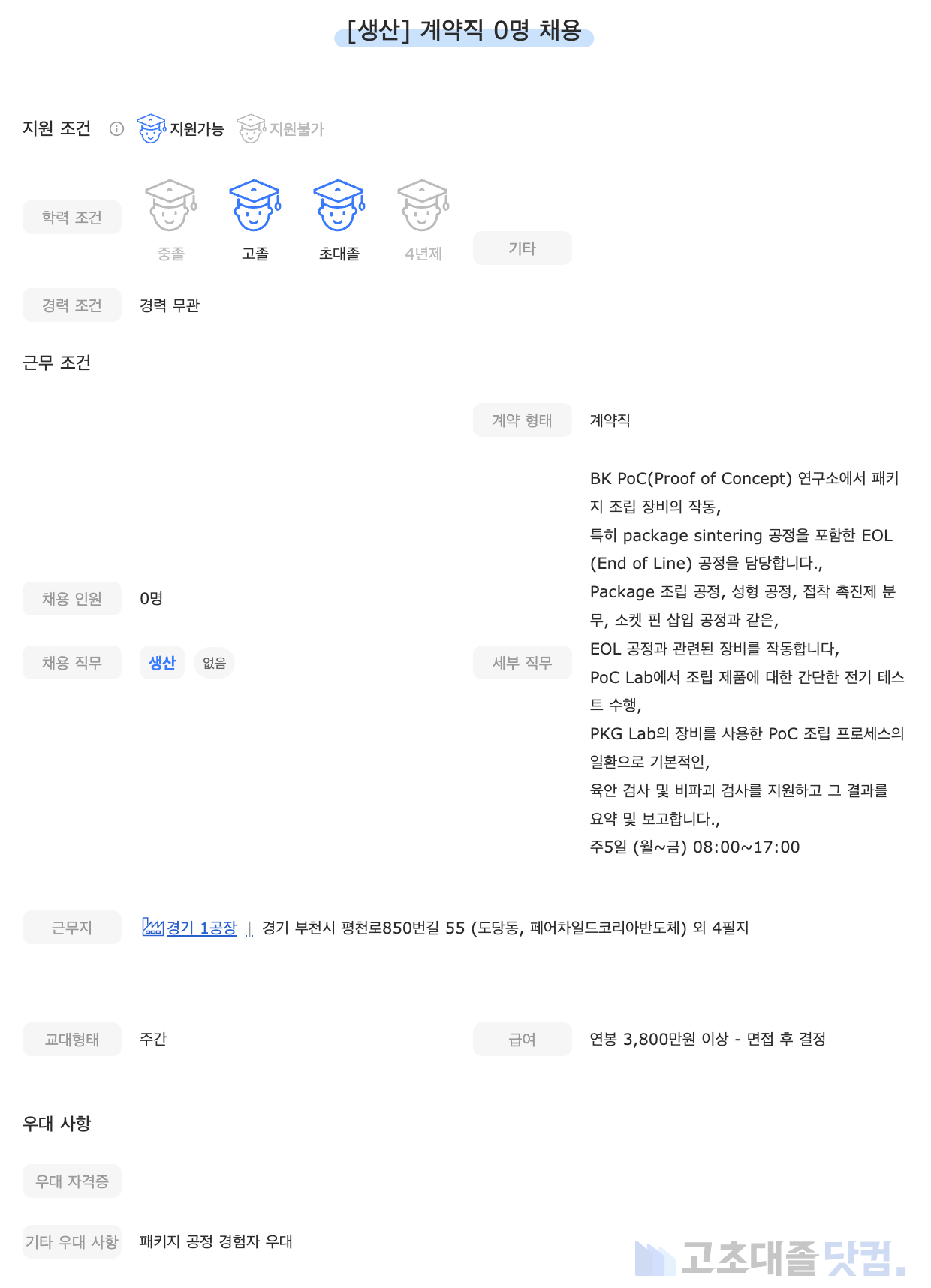 [온세미컨덕터코리아] 생산 주간근무 0명 계약직 채용
