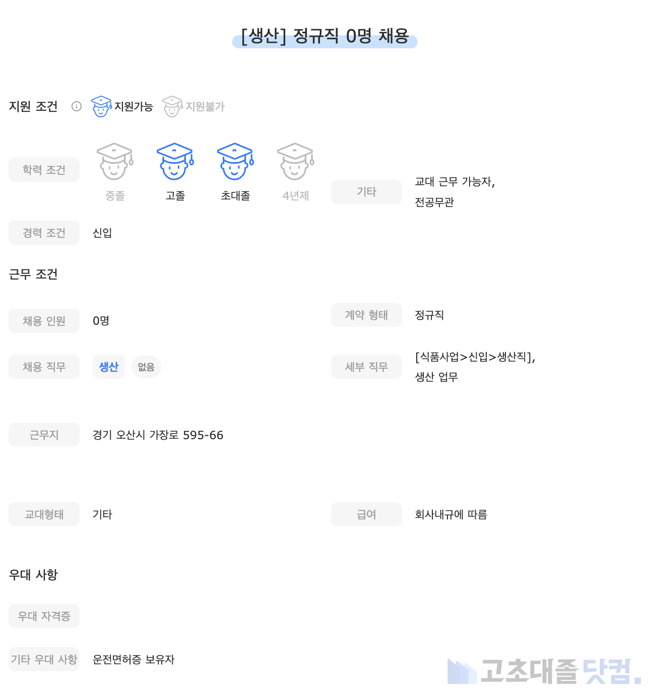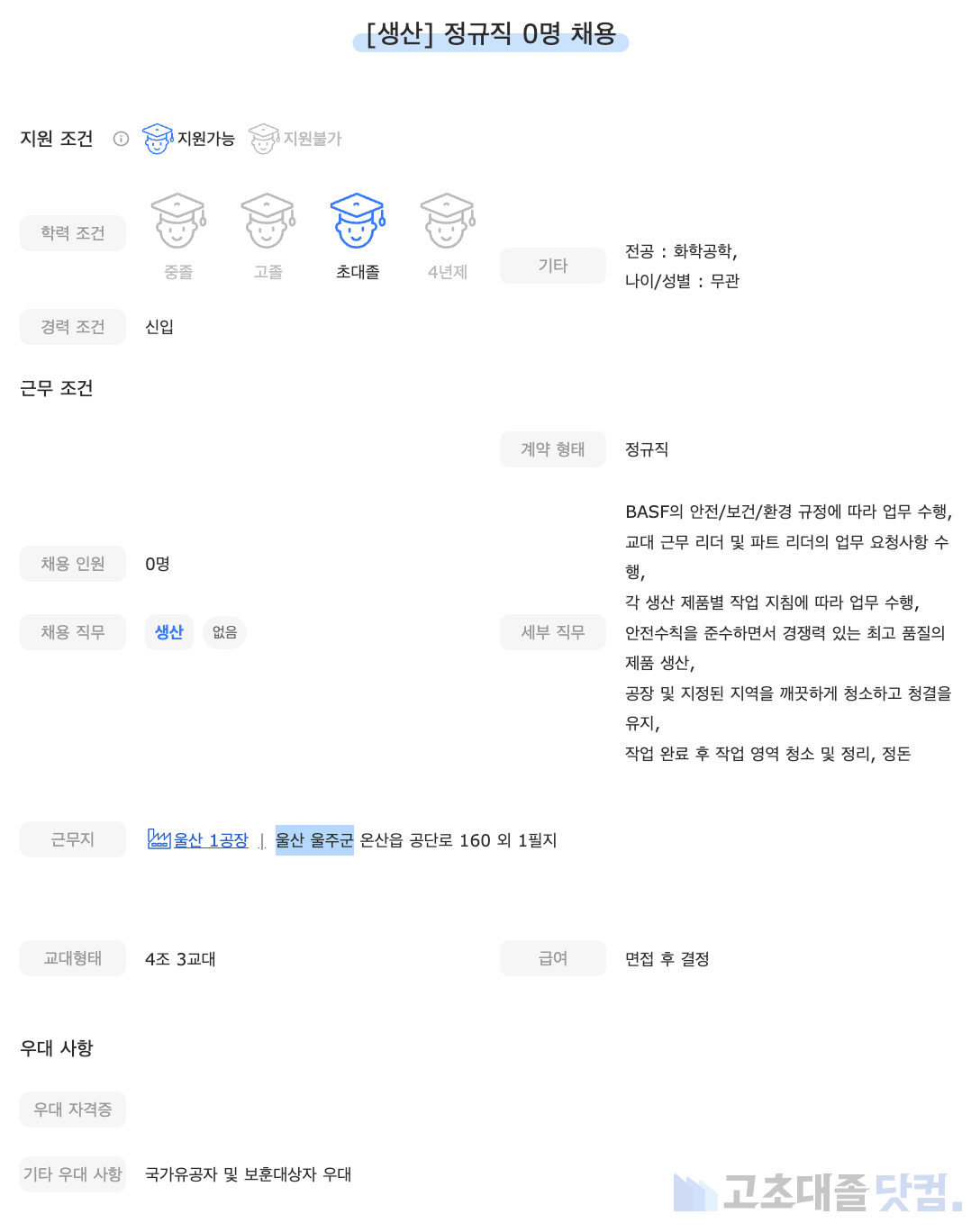 [대상주식회사] 생산 신입 0명 정규직 채용