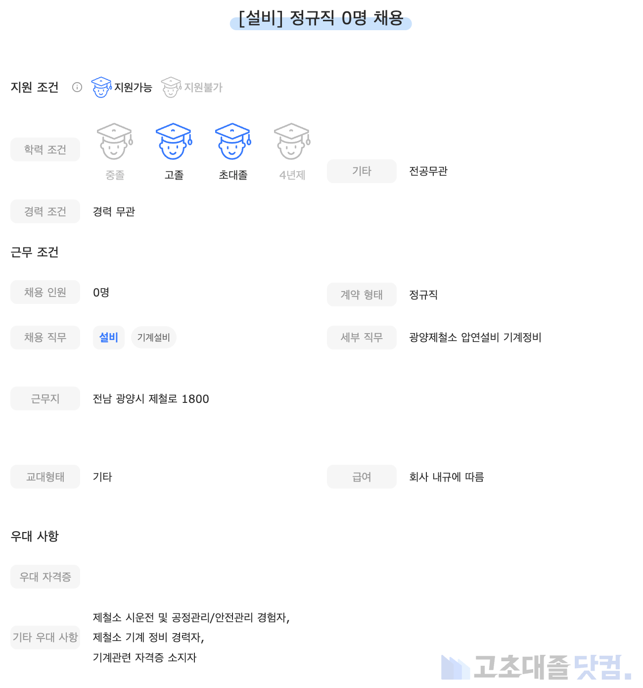 [포스코] 포스코GYR테크 정비(기계) 정규직 채용