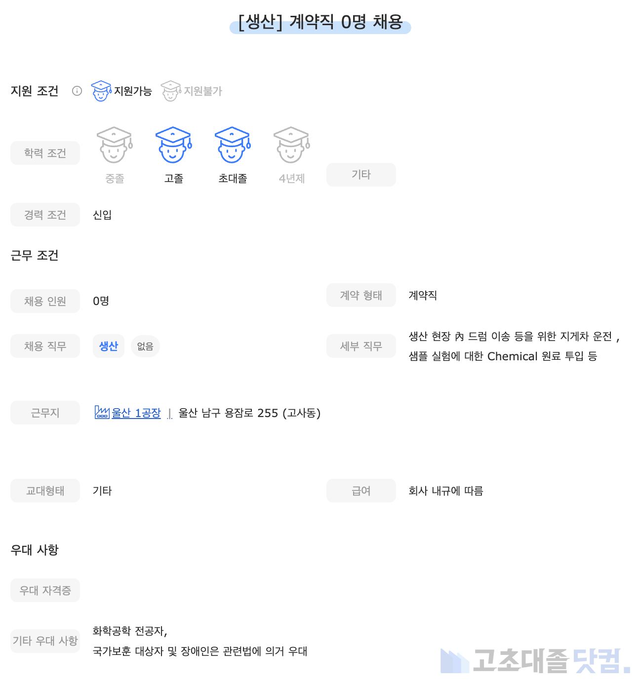 [SK피유코어] 생산지원 신입 0명 계약직 채용